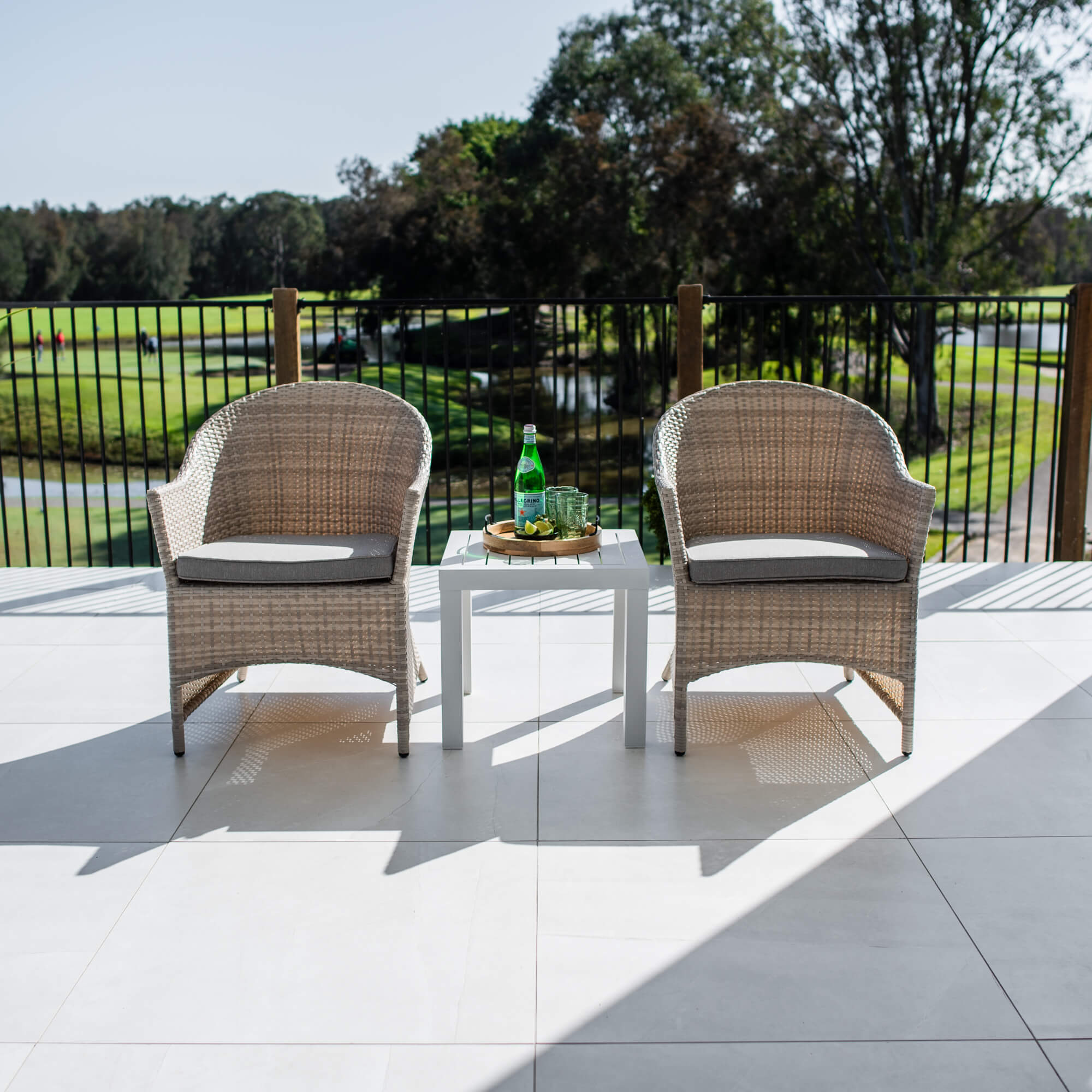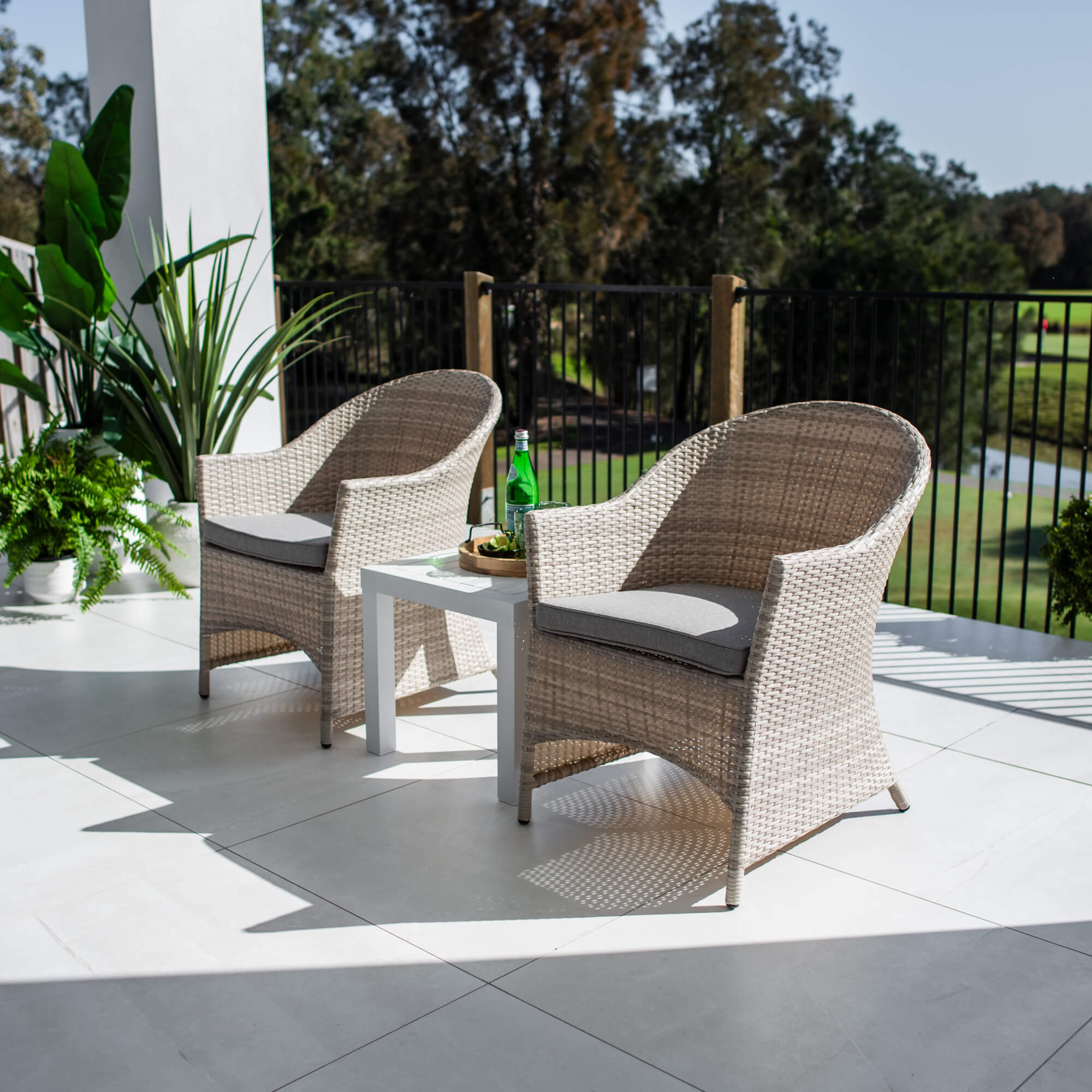 Crafted with Aluminium Frames and a Slatted Top, the Slat Side Table provides style and durability. The Boston Chairs are made with Aluminium Frames and Wintec Wicker to provide support and strength. This chair includes the seat cushion for extra comfort.