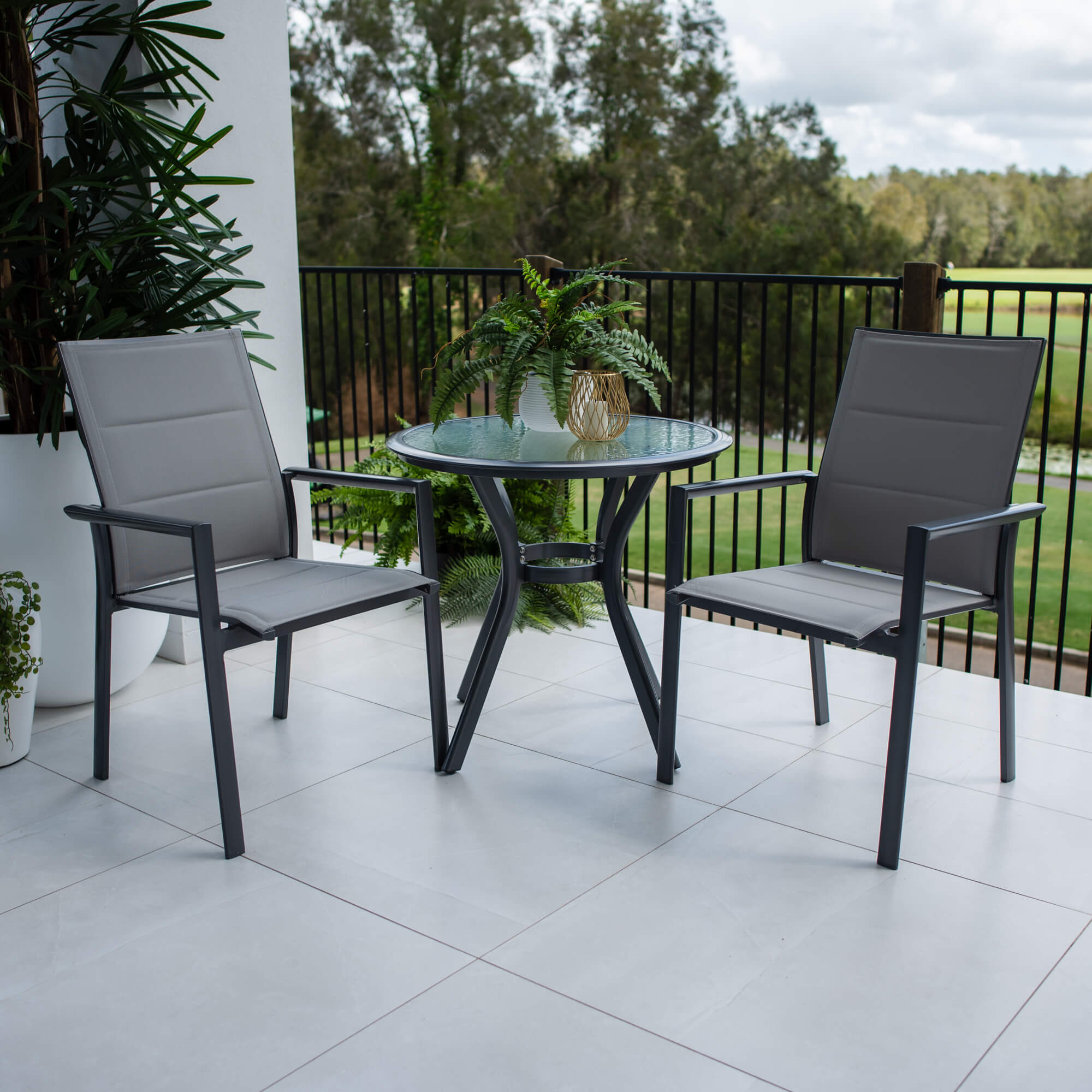 Crafted with Aluminium Frames and a Tempered Glass Top, the Coventry Table provides style and durability. The Margot Chairs are made with Aluminium Frames and a Padded Textilene Sling to provide comfort and strength.