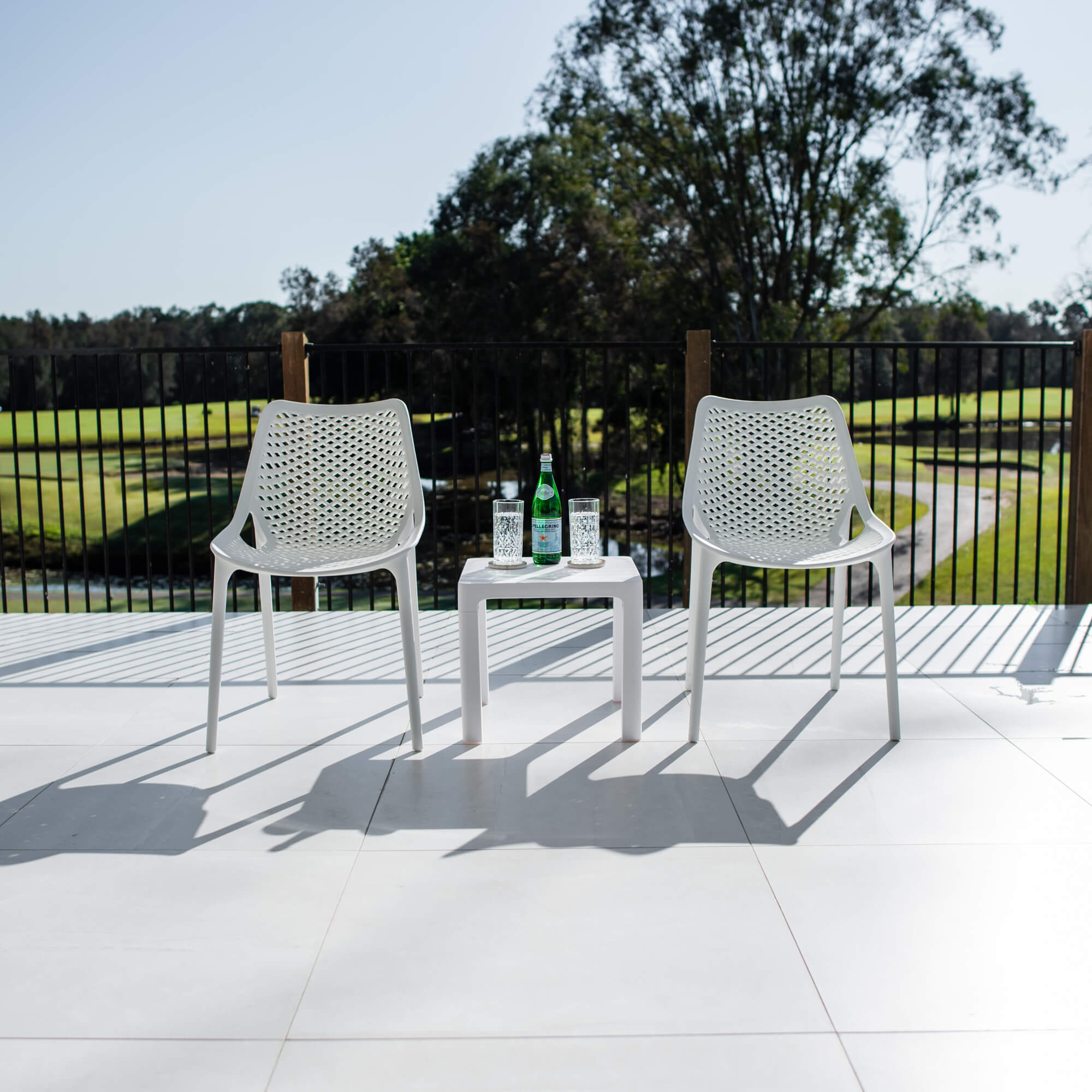 This outdoor setting includes 1 x Bali Side Table and 2 x Roma Dining Chairs