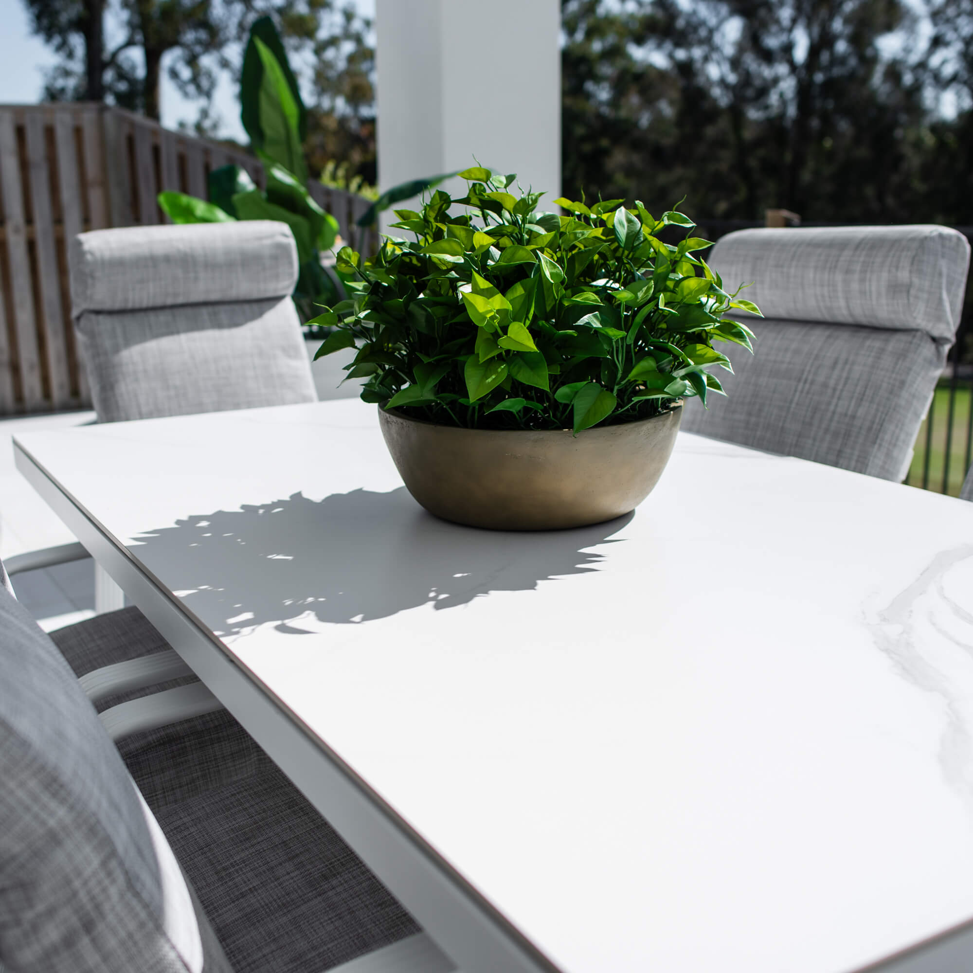 Crafted with Aluminium Frames and a Sintered Stone Top, the Malibu Table provides style and durability. The Andorra Chairs are made with Aluminium Frames and a Textilene Cushion to provide comfort and strength. These chairs also have a high back to provide extra support.