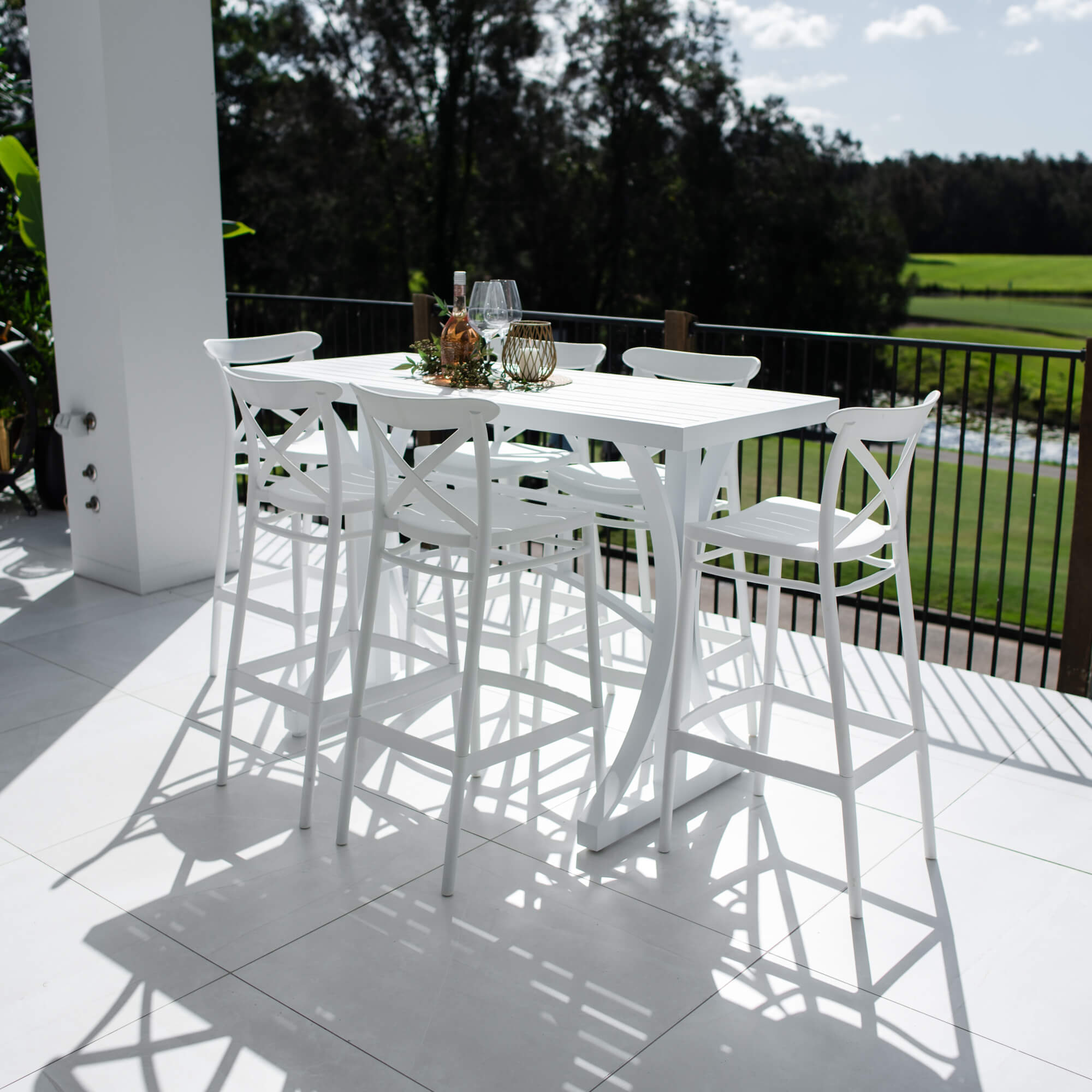 Crafted with Aluminium Frames and a Slatted Top, the Bergen Bar Table features a pedastal leg system, which provides style and strength. The Portsea 75 Bar Stools are made out of a Resin material with a cross back design that provides durability and style. These bar stools are great for classic or hamptons style homes.