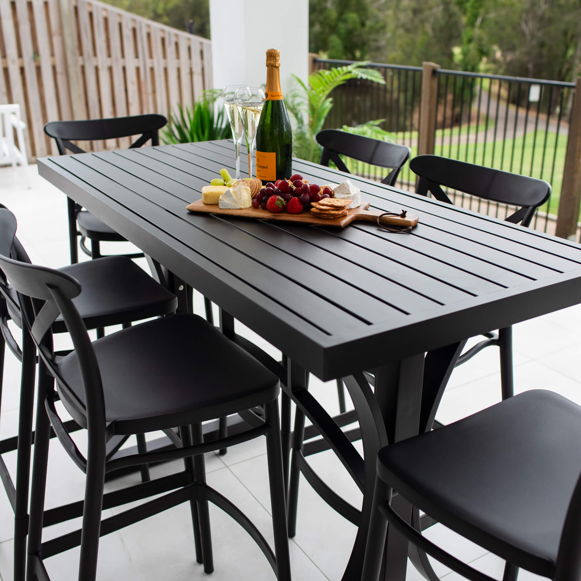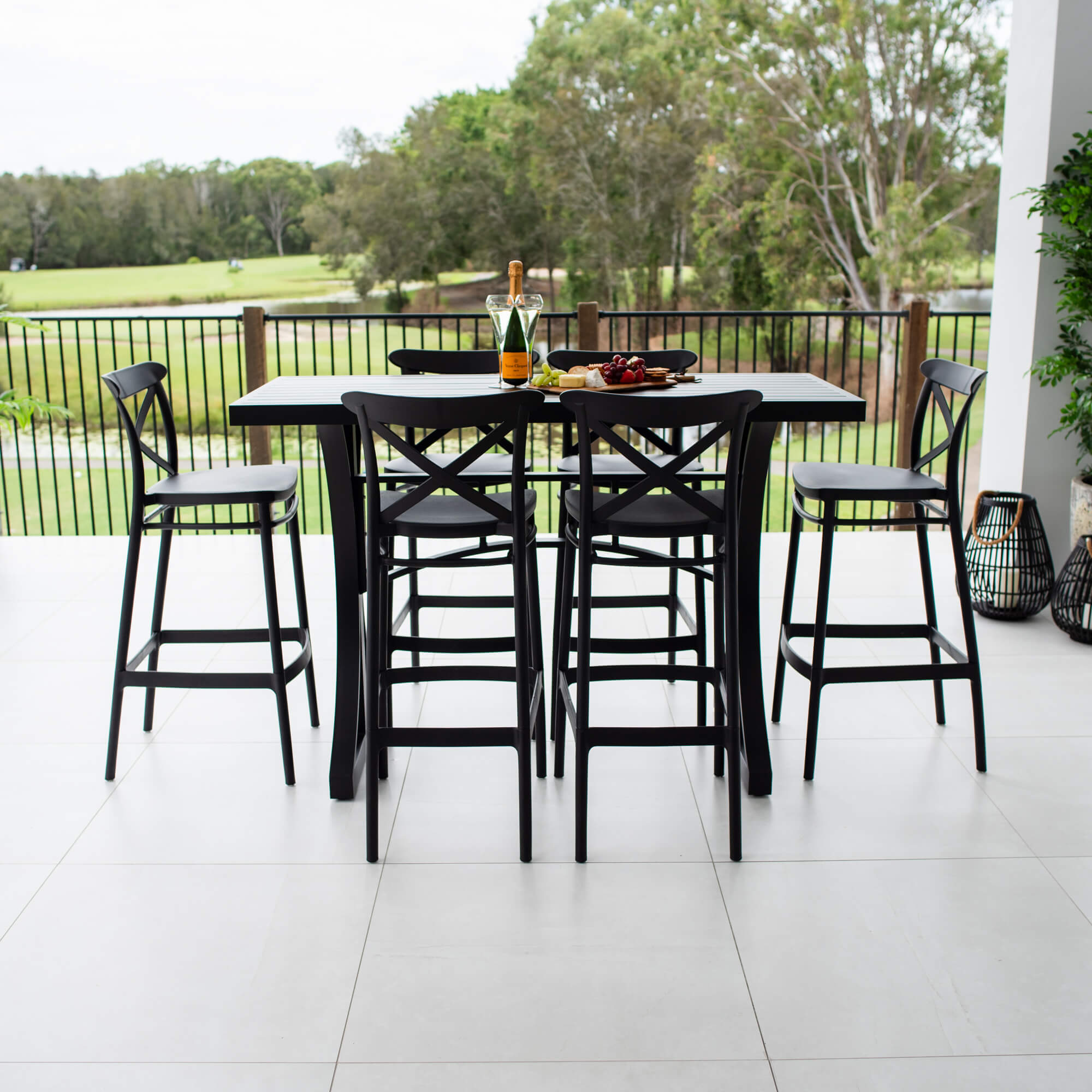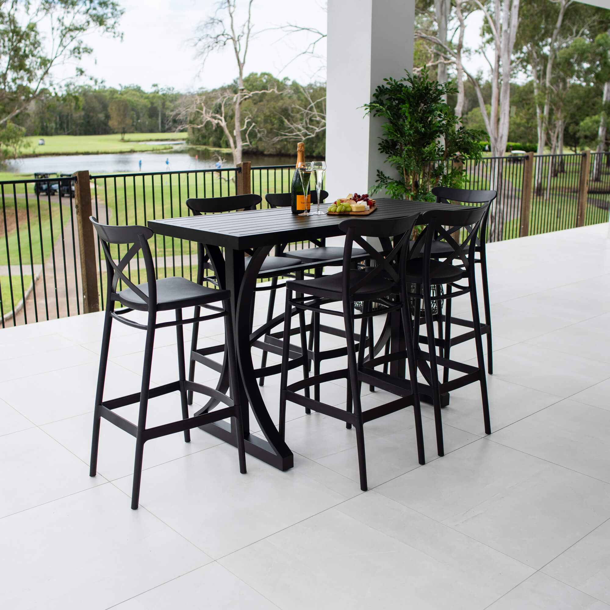This outdoor setting includes 1 x Bergen Bar Table and 6 x Portsea 75 Bar Stools