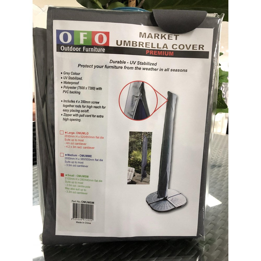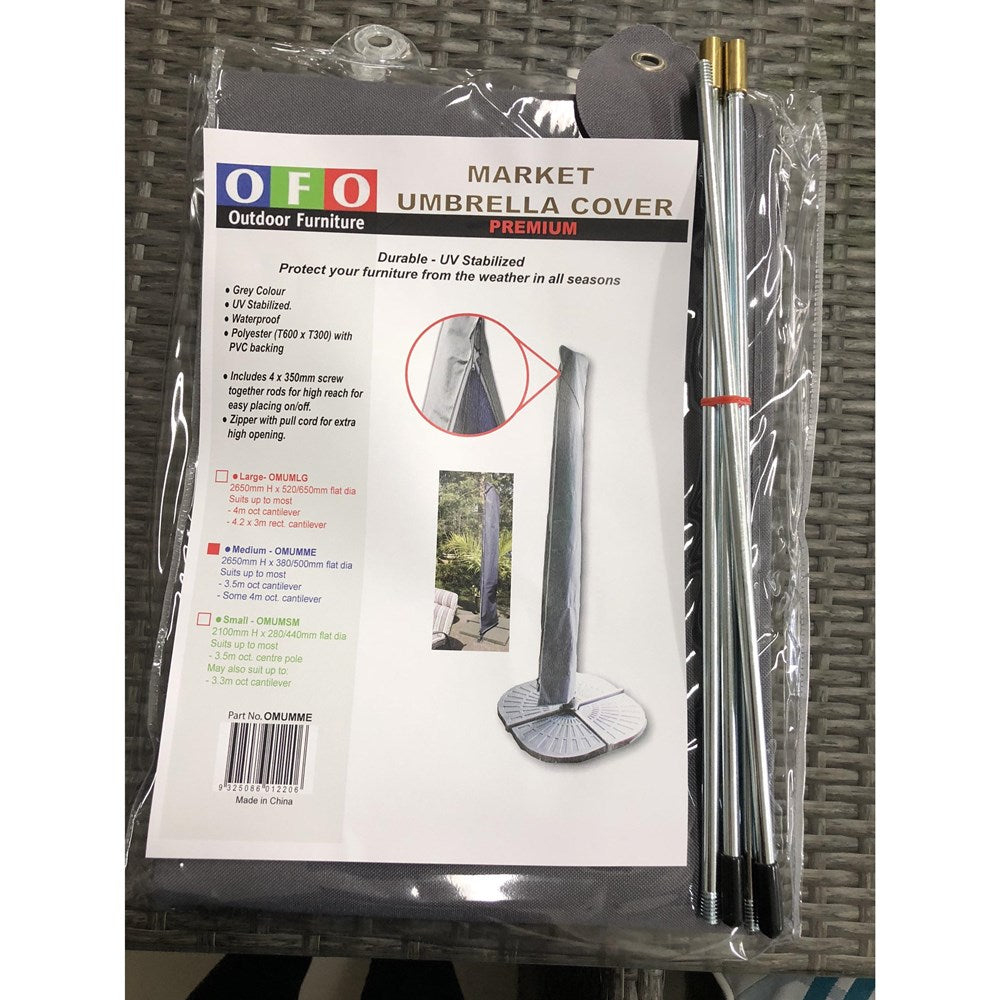 Protect your Market and Cantilever umbrellas with these expertly designed covers. Made from durable, UV-stabilized polyester in a sleek grey color, they offer robust waterproof protection. Each cover includes four 350mm long, X 6mm diameter heavy-duty screw-together rods, enabling easy placement and removal even at high reach. The zipper features a pull cord for convenient access through an extra-high opening, ensuring both functionality and long-lasting umbrella care.