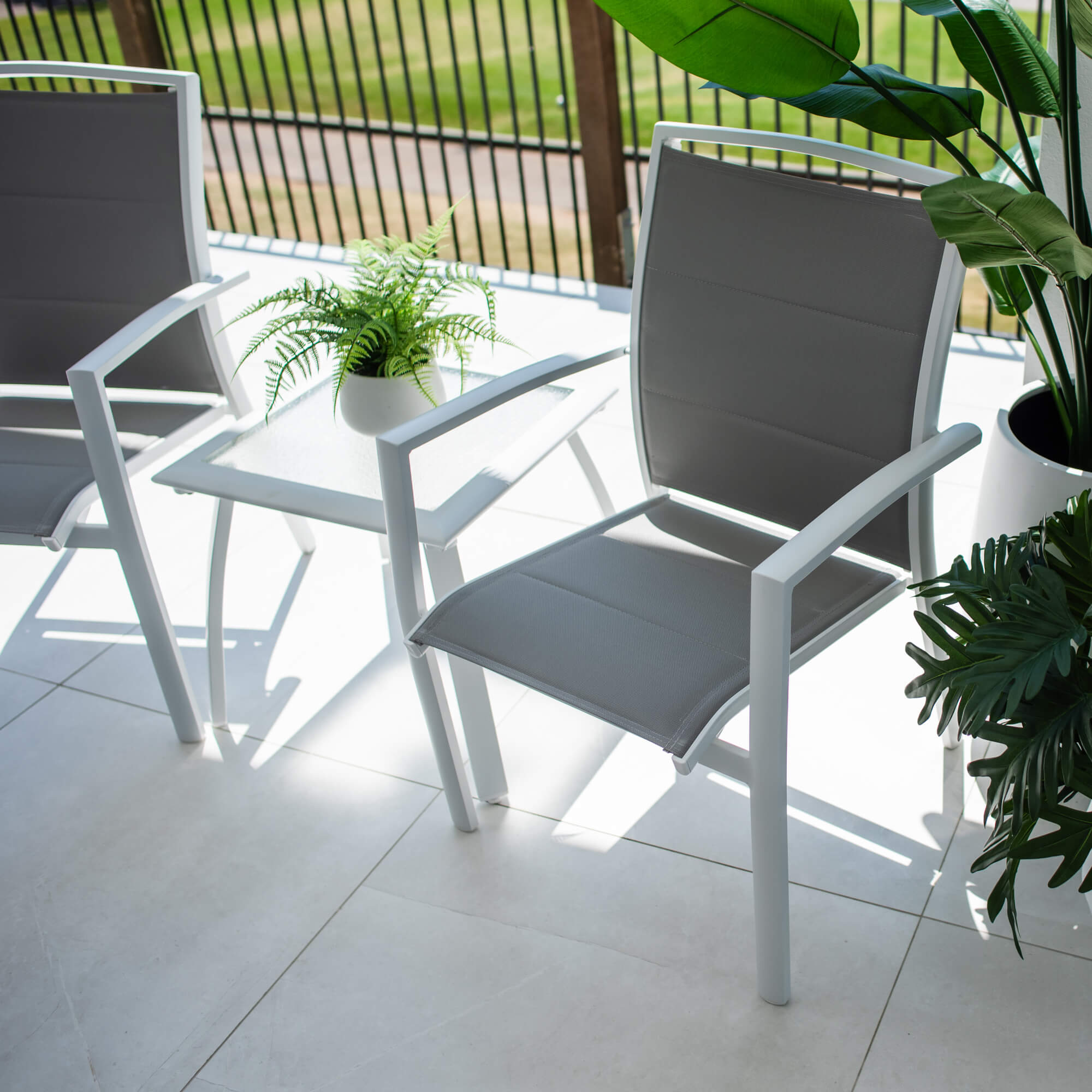 Crafted with Aluminium Frames and a Tempered Glass Top, the Shelby Side Table provides style and durability. The Shelby Chairs are made with Aluminium Frames and a Padded Textilene Sling to provide comfort and strength. This chair has an arched back for extra lumbar support.