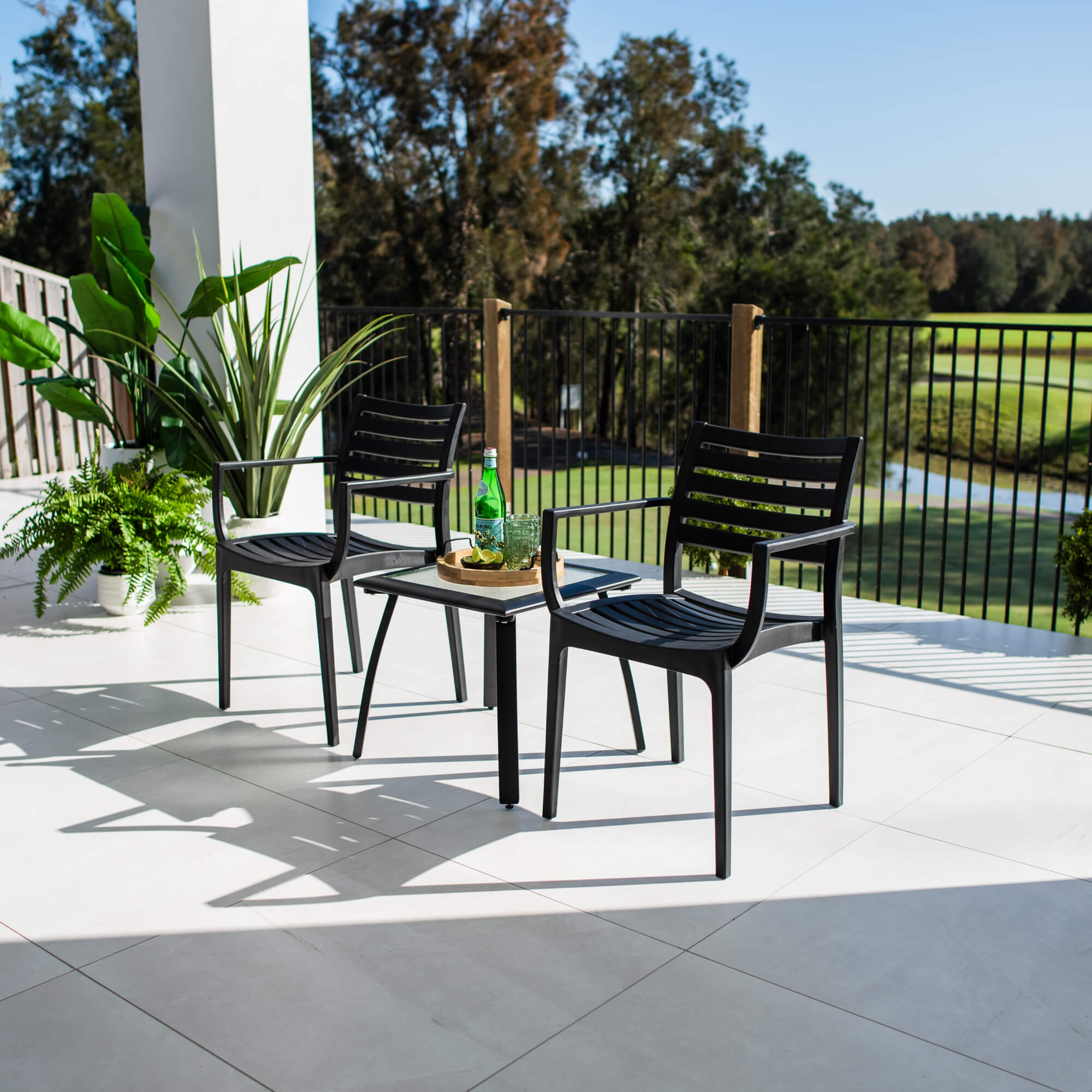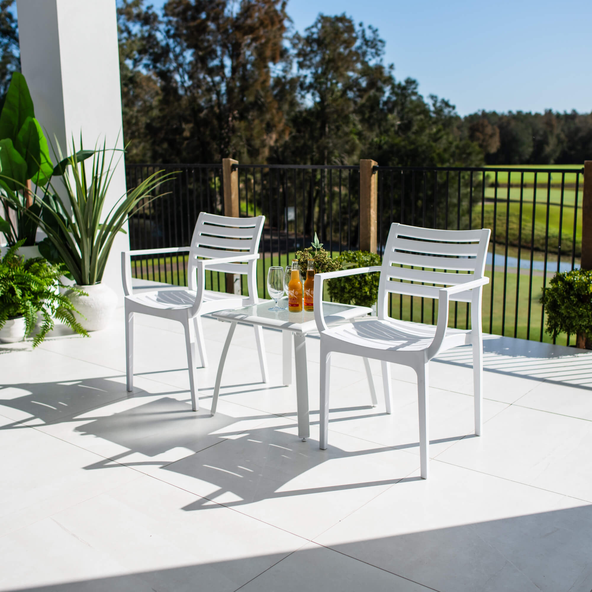 This outdoor setting includes 1 x Shelby Side Table and 2 x Apollo XL Dining Chairs
