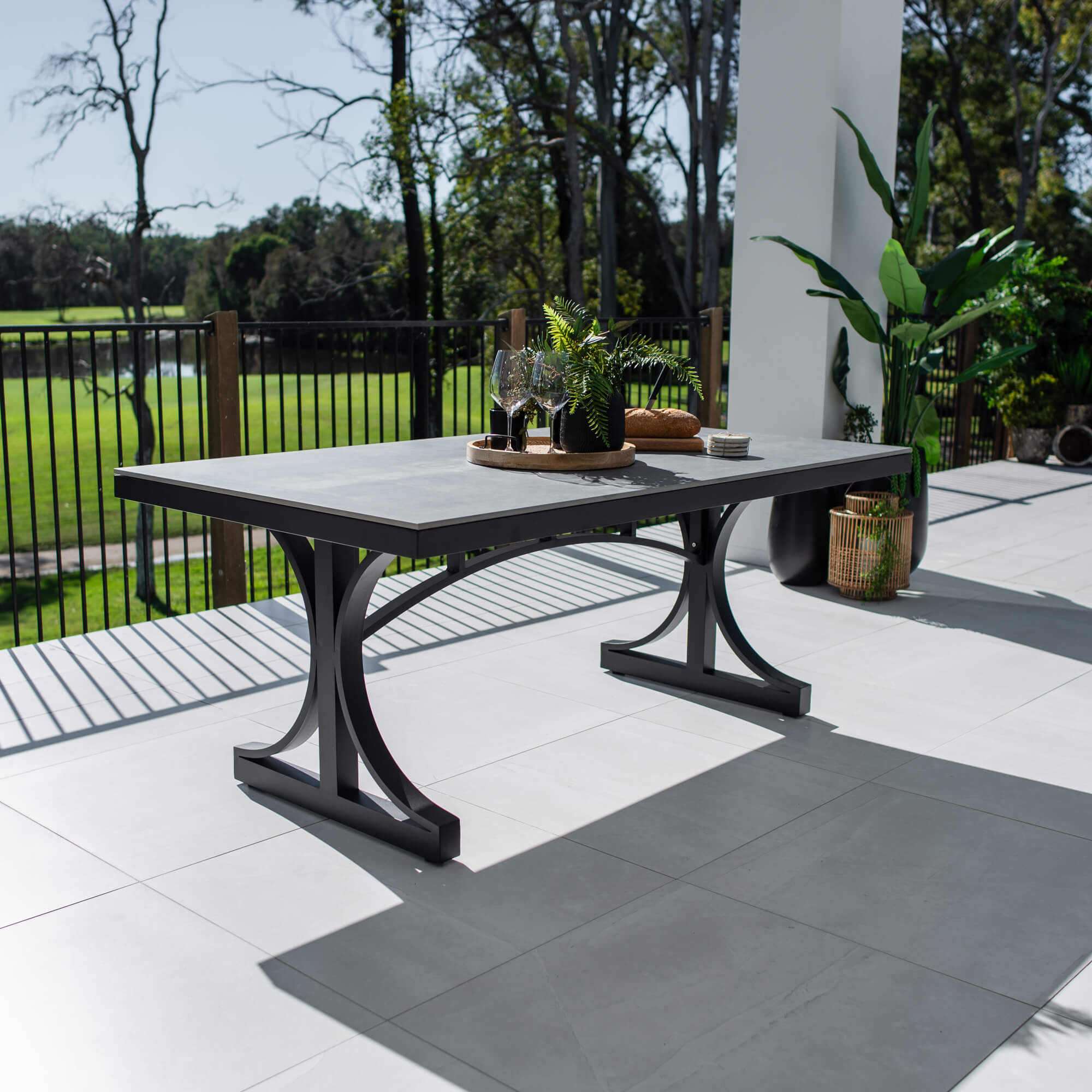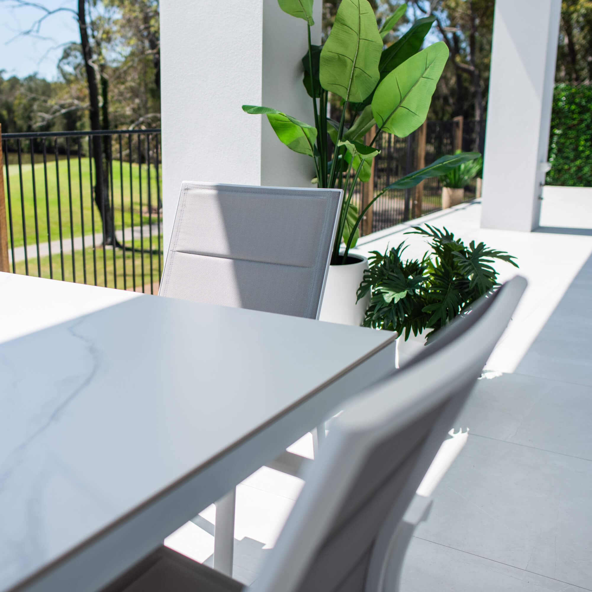 Crafted with Aluminium Frames and a Sintered Stone Top, the Malibu Table provides style and durability. The Margot Chairs are made with Aluminium Frames and a Padded Textilene Sling to provide comfort and strength.
