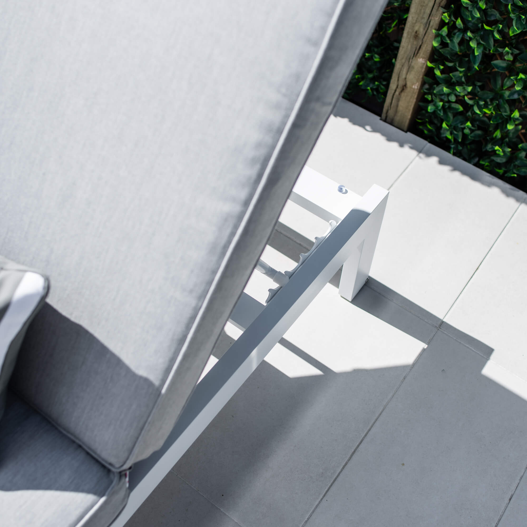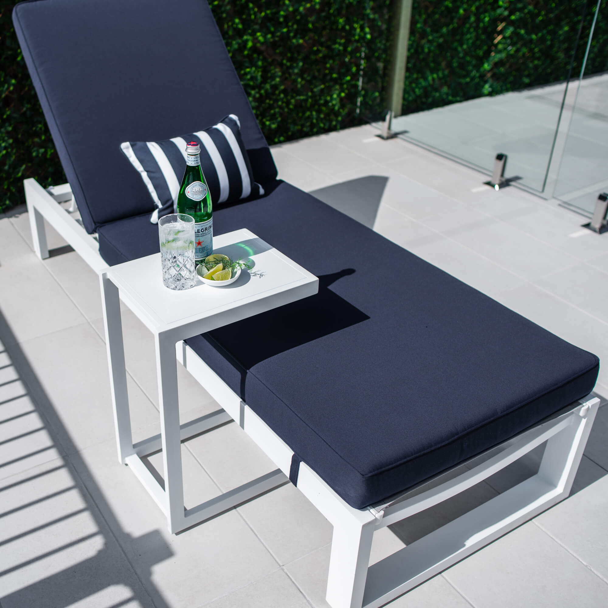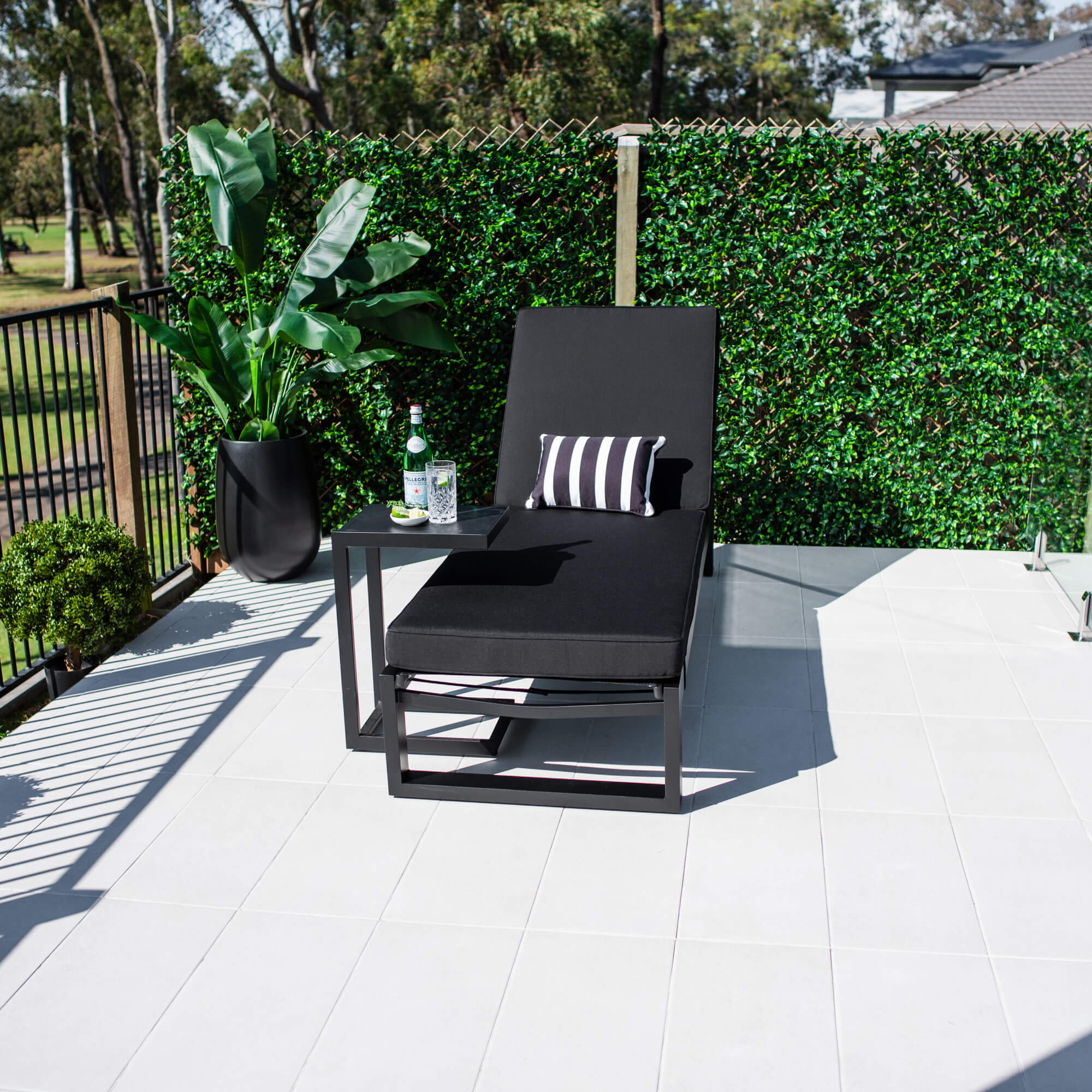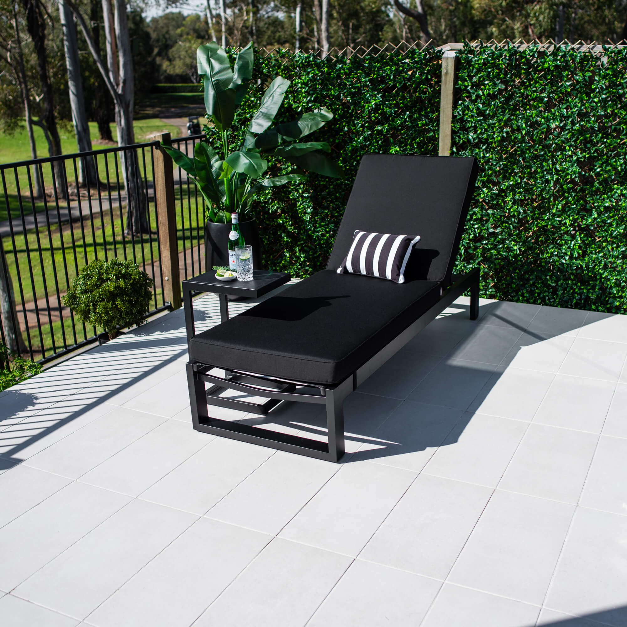 The Milan Sun Lounge is one of our best selling lounges for quality and style with the contemporary, squared design. Crafted with Power Coated Aluminium frames and a Textilene Sling, the sun lounge is fully welded with an adjustable back to change the height of the headrest. This package pairs the Milan sun lounge with our Menzin C-Shaped Side Table, and sunbrella sun lounge cushion.