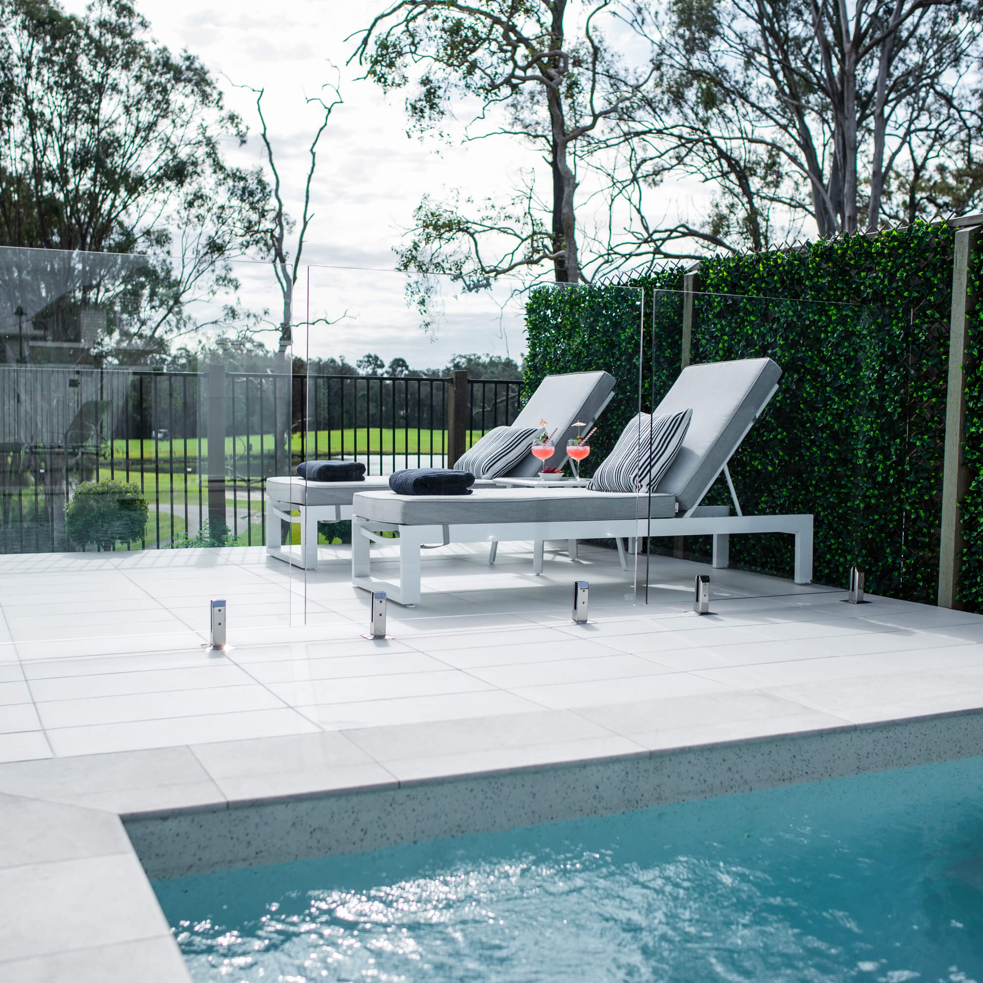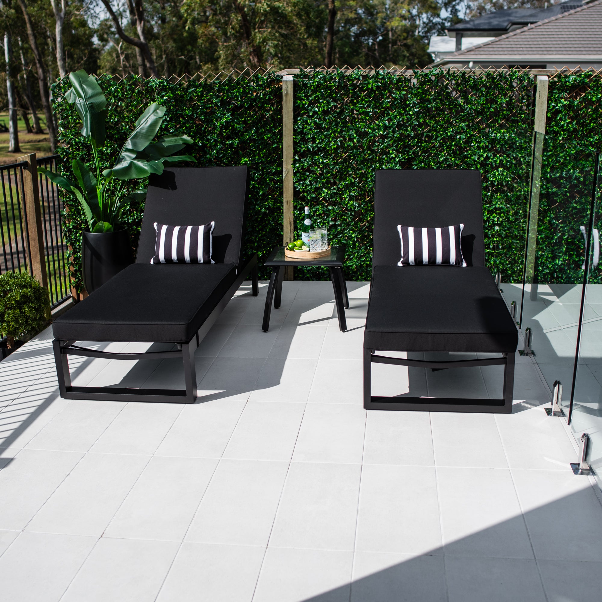 The Milan Sun Lounge is one of our best selling lounges for quality and style with the contemporary, squared design. Crafted with Power Coated Aluminium frames and a Textilene Sling, the sun lounge is fully welded with an adjustable back to change the height of the headrest. This package pairs the Milan sun lounge with our tempered glass, aluminium Shelby Side Table, and sunbrella sun lounge cushions.