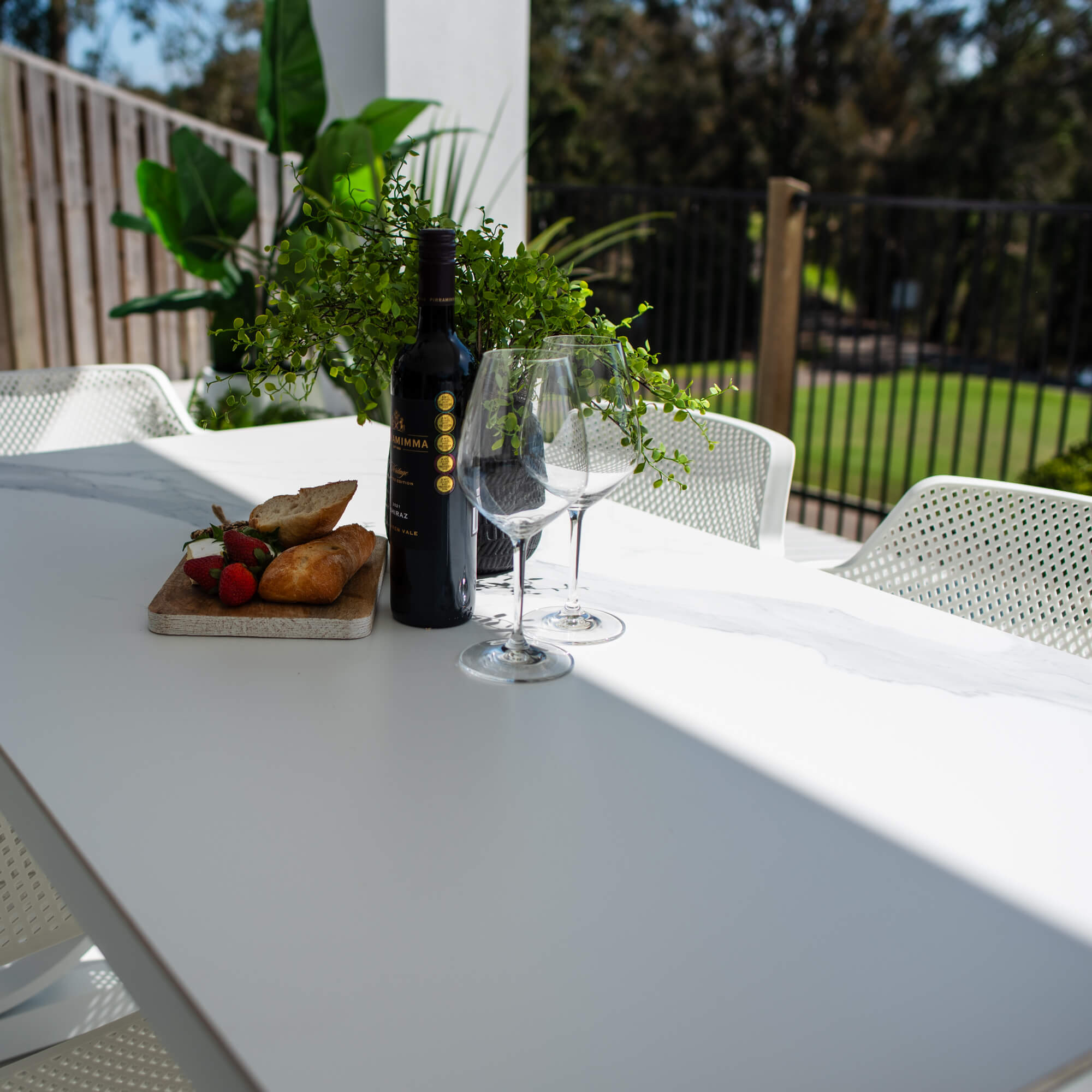 Crafted with Aluminium Frames and a Sintered Stone Top, the Malibu Table provides style and durability. The Nero Chairs are made with Resin Frames to provide support and strength. Add our Aspen Seat Cushion for extra comfort.