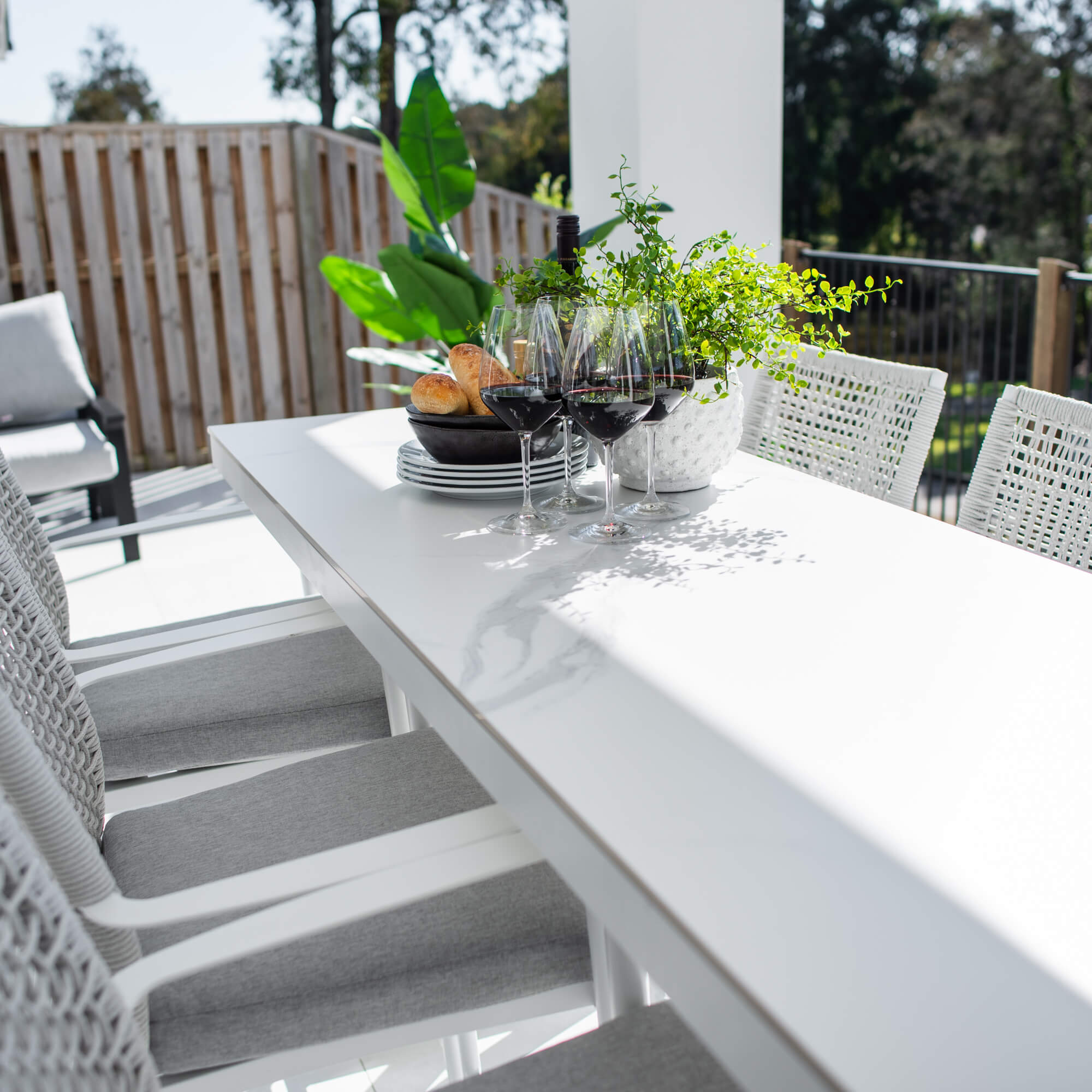 Crafted with Aluminium Frames and a Sintered Stone Top, the Malibu Table provides style and durability. The Vienna Rope Barstools are made with Aluminium Frames and Textilene Rope to provide support and strength. This barstool includes the seat cushion for extra comfort.