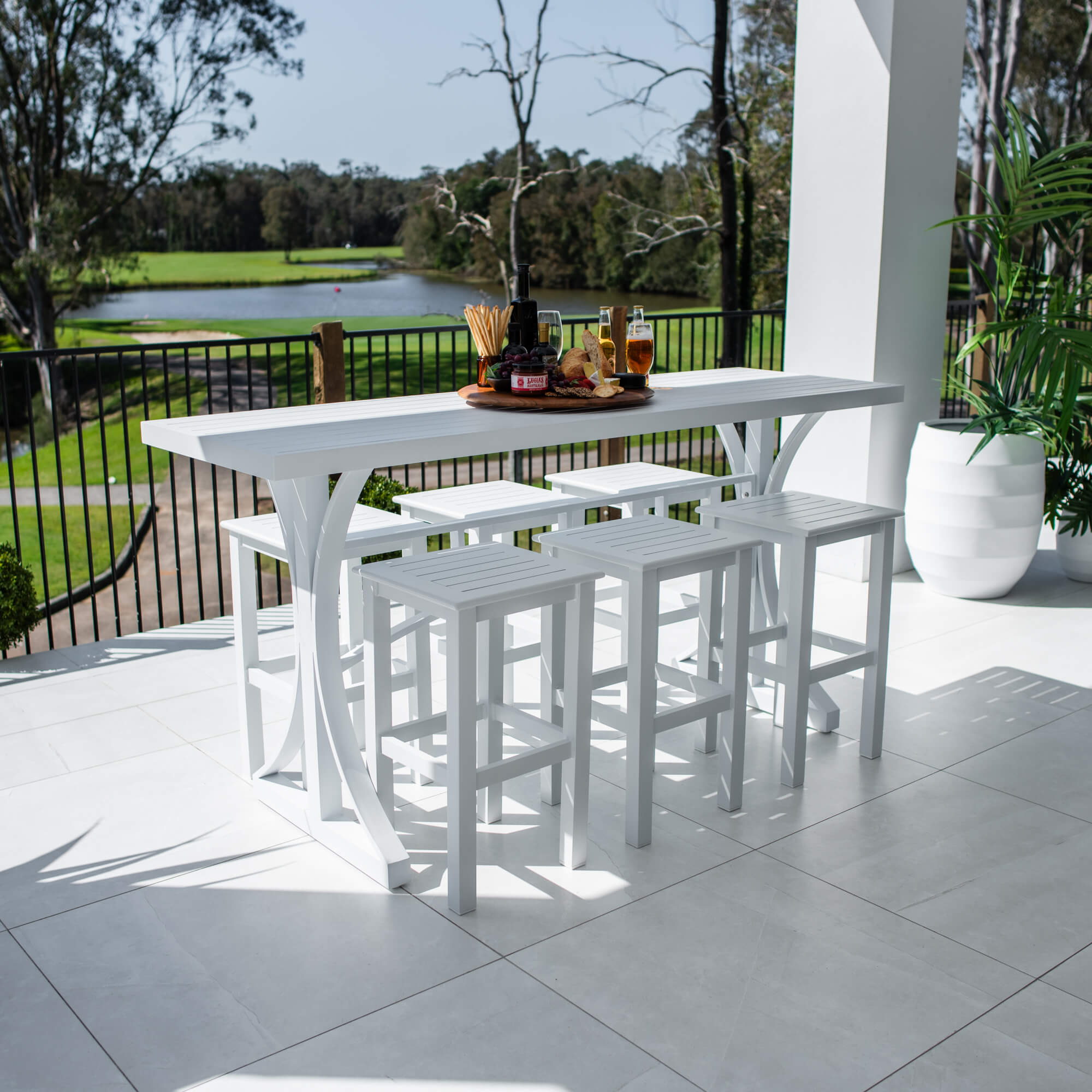 This outdoor setting includes 1 x Bergen Bar Table and 6 x Kirra Bar Stools