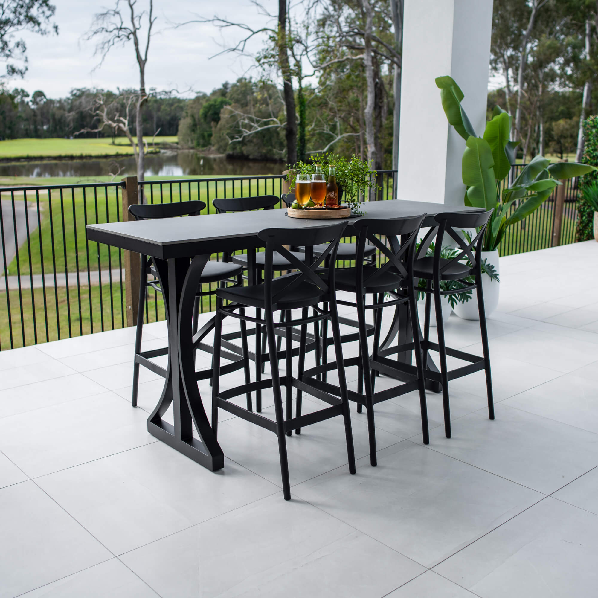 This outdoor setting includes 1 x Malibu Bar Table and 6 x Portsea 75 Bar Stools.