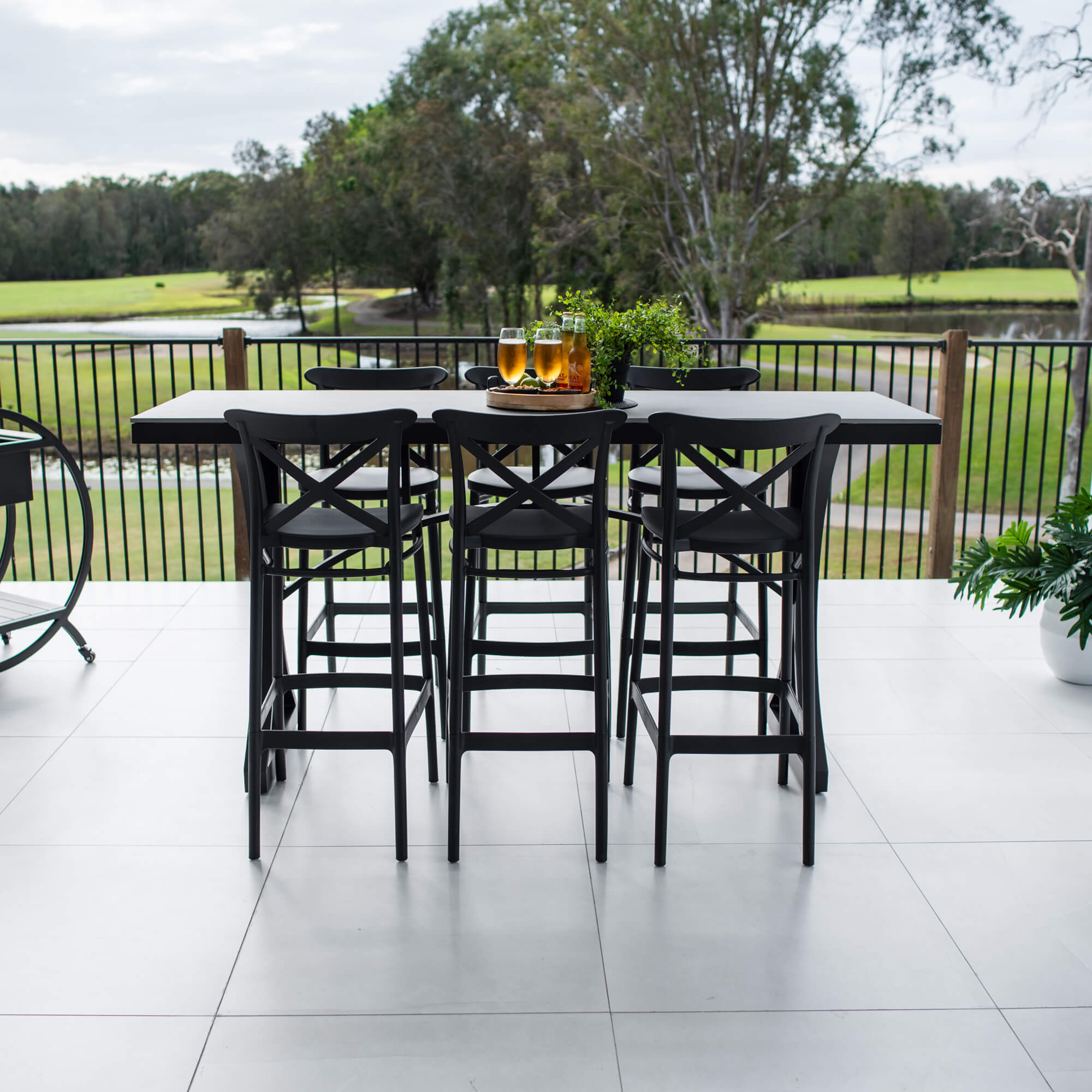 Crafted with Aluminium Frames and a Sintered Stone Top, the Malibu Table provides style and durability.The Portsea 75 Bar Stools are made out of a Resin material with a cross back design that provides durability and style. These bar stools are great for classic or hamptons style homes.
