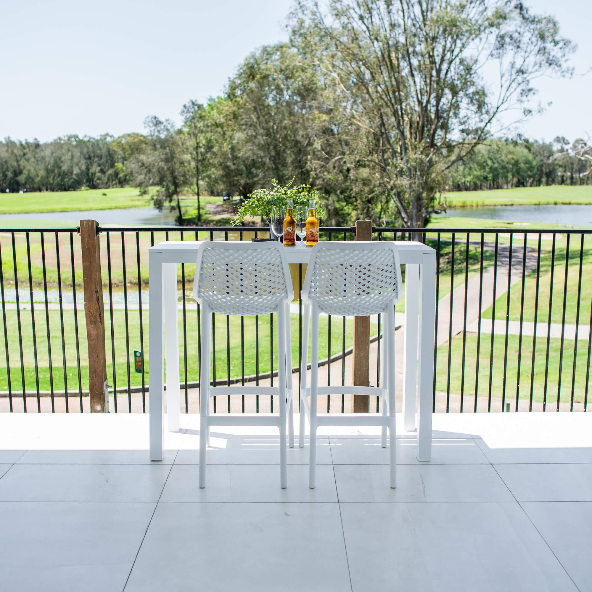 This outdoor setting includes 1 x Aria Bar Table and 2 x Roma 75 Bar Stools