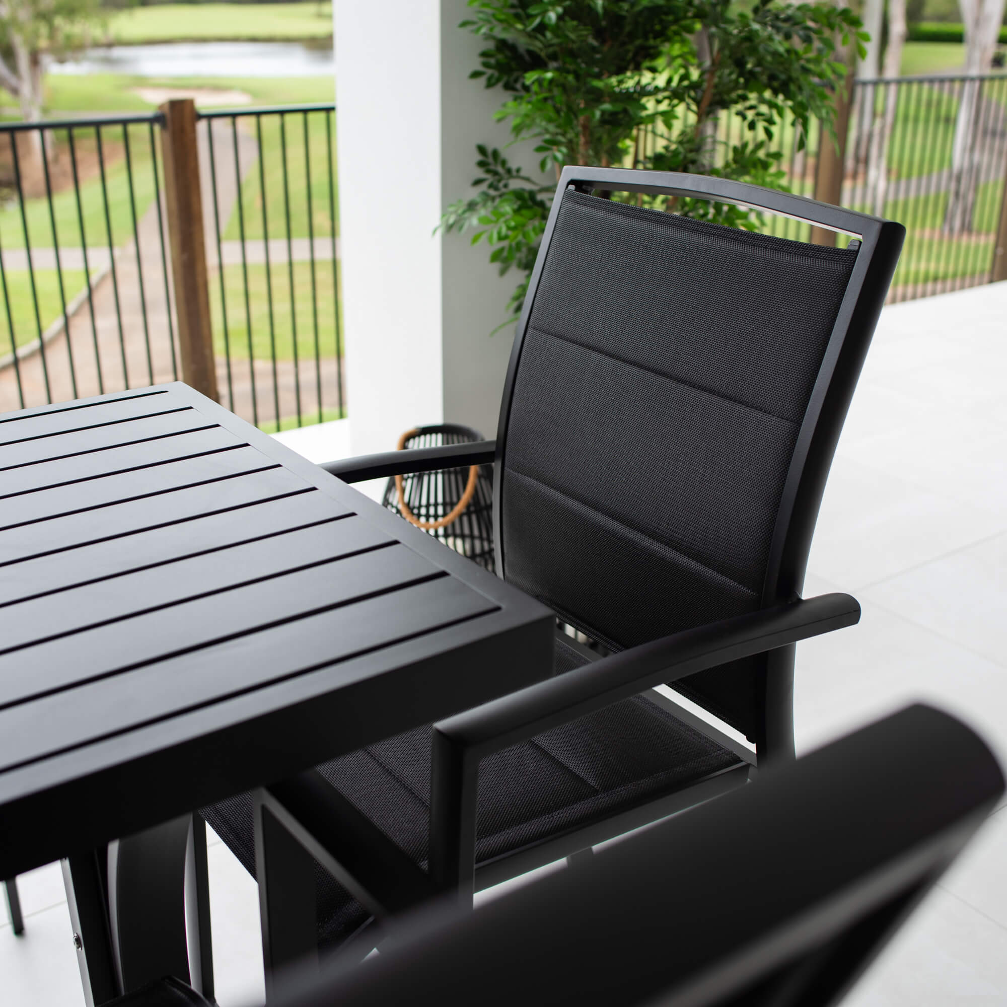 Crafted with Aluminium Frames and a Slatted Top, the Bergen Bar Table provides style and durability. The Shelby Bar Stools are made out of Powder Coated Aluminium with a Padded Textilene Sling. This barstool has also been designed with an arched back for extra lumbar support.