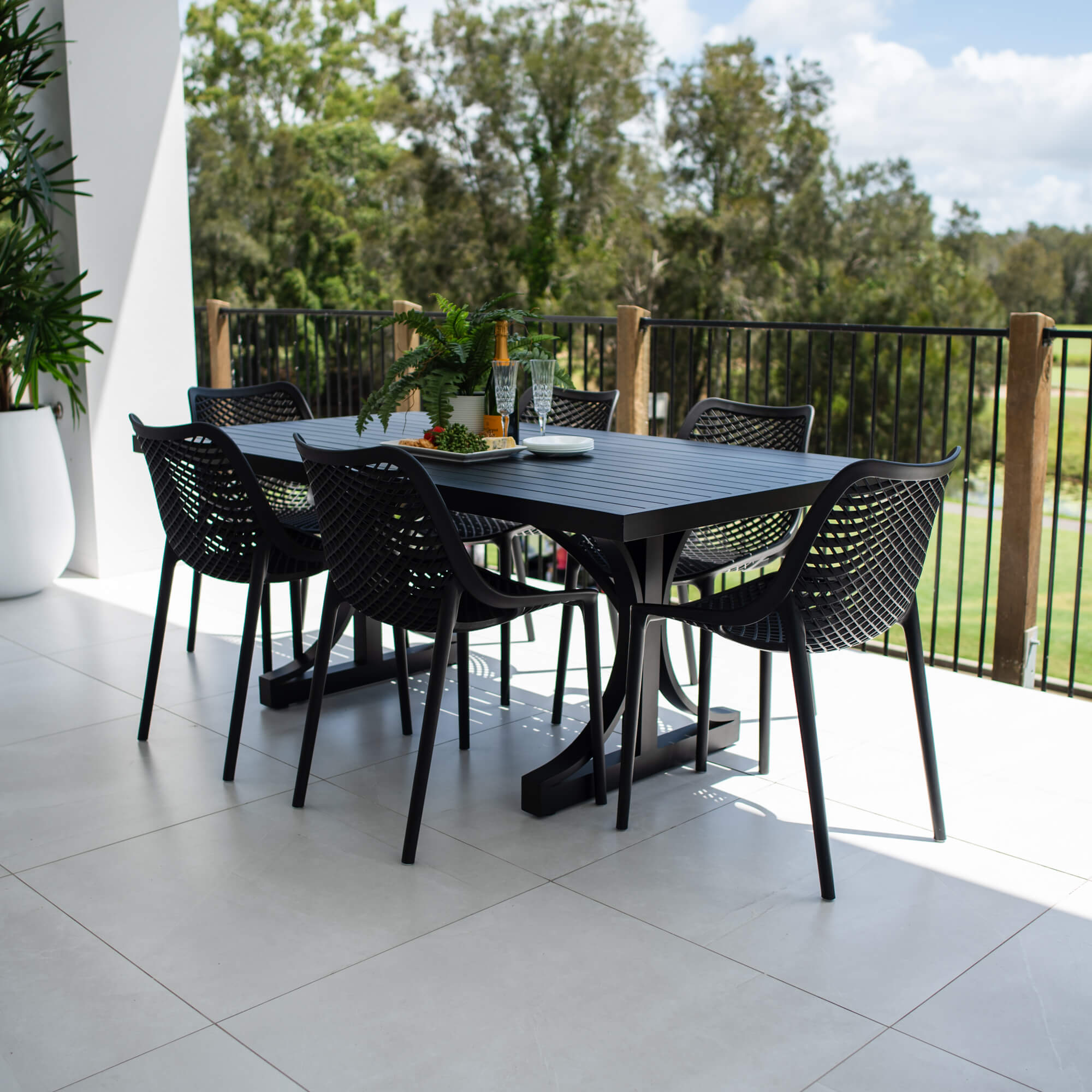 This outdoor setting includes 1 x Bergen Dining Table and 6 x Roma Dining Chairs