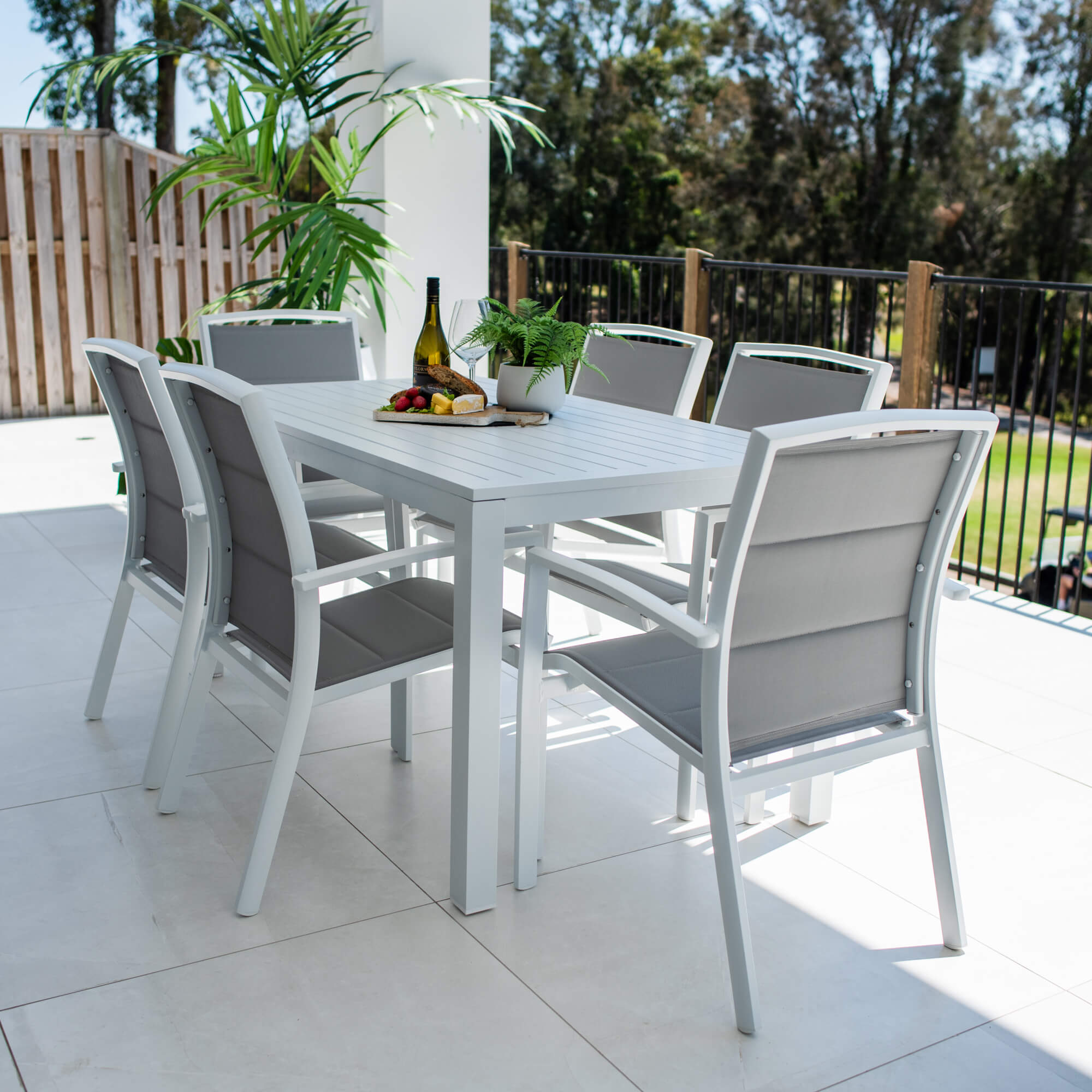 This outdoor setting includes 1 x Aria Dining Table and 6 x Shelby Dining Chairs