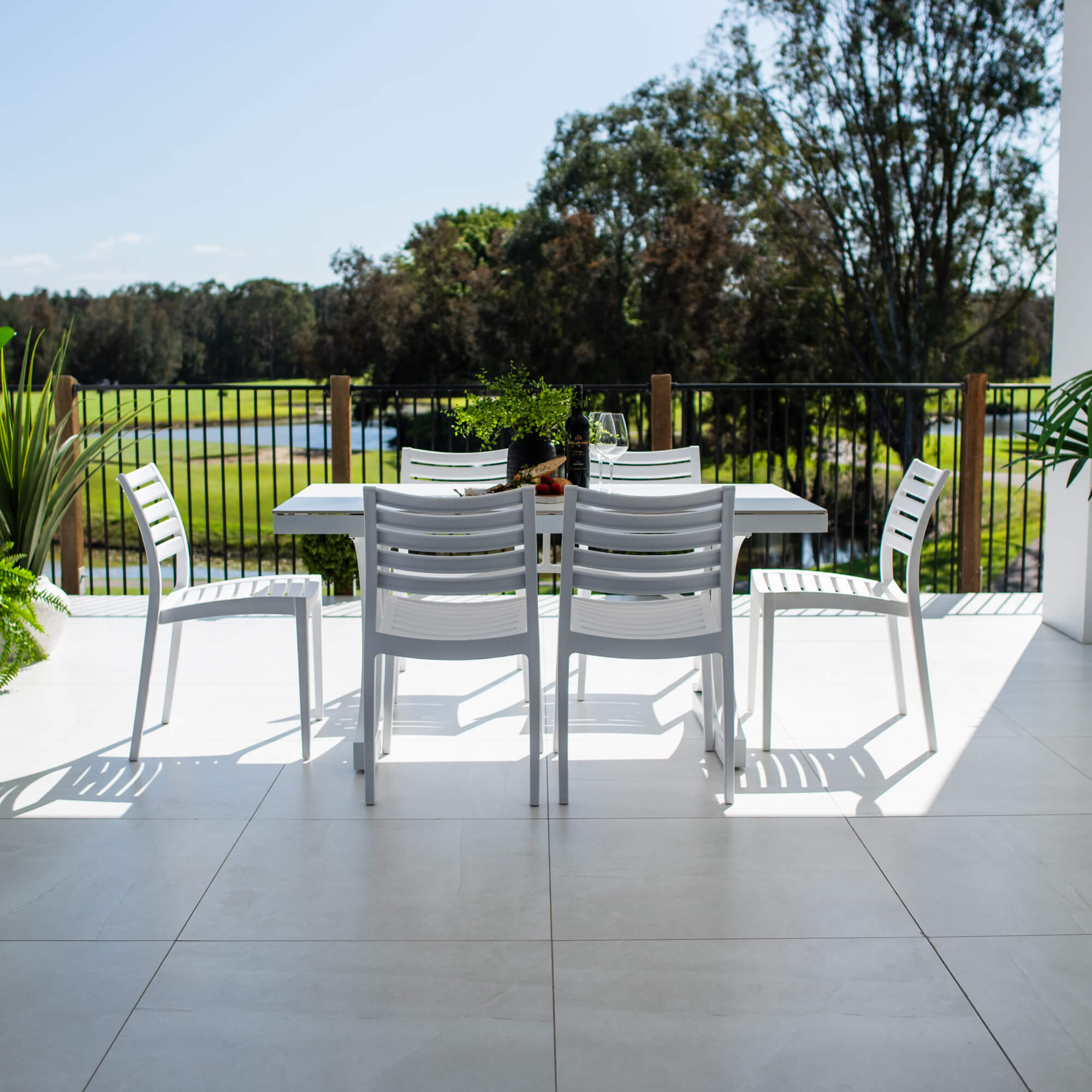 This outdoor setting includes 1 x Malibu Dining Table and 6 x Apollo Dining Chairs