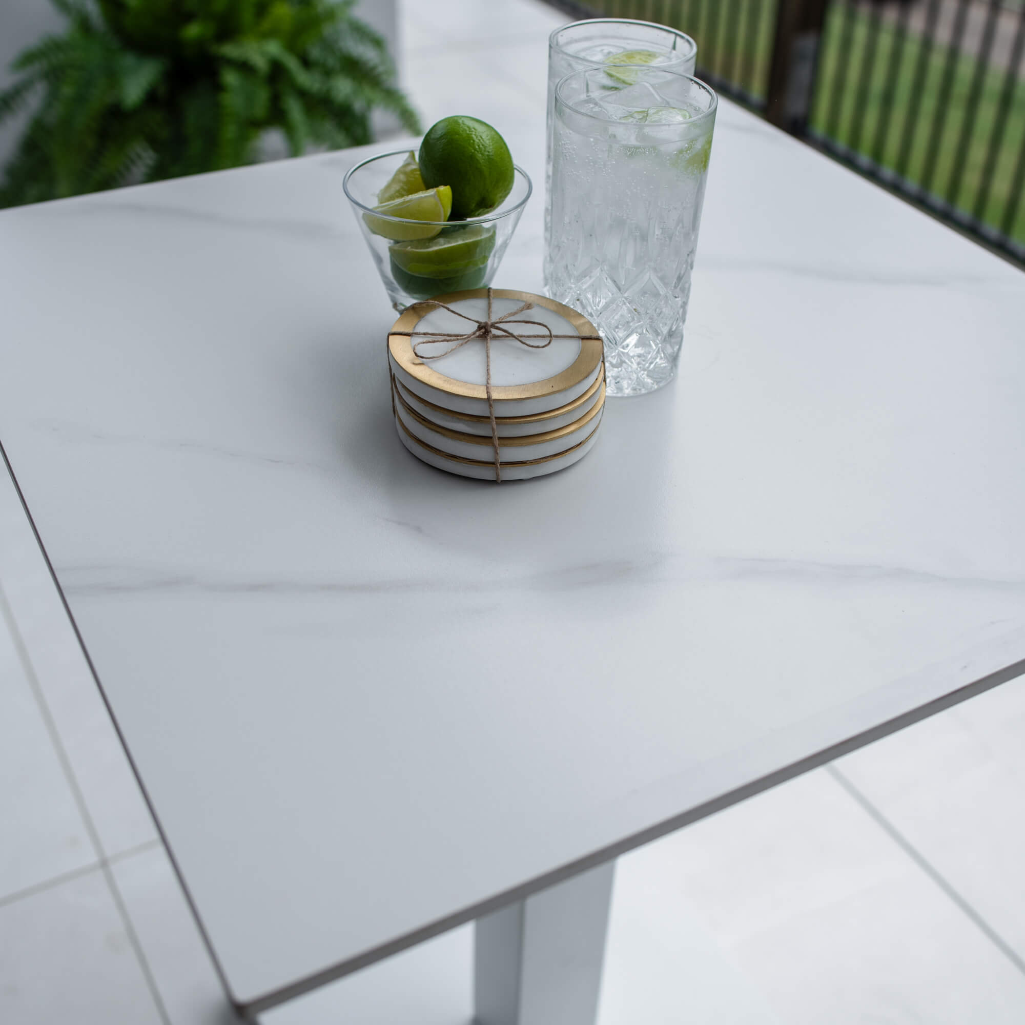 Aluminium Frame, 11mm sintered stone top dining table with marble stone at the bottom, with 1.5mm sheet alum cover.