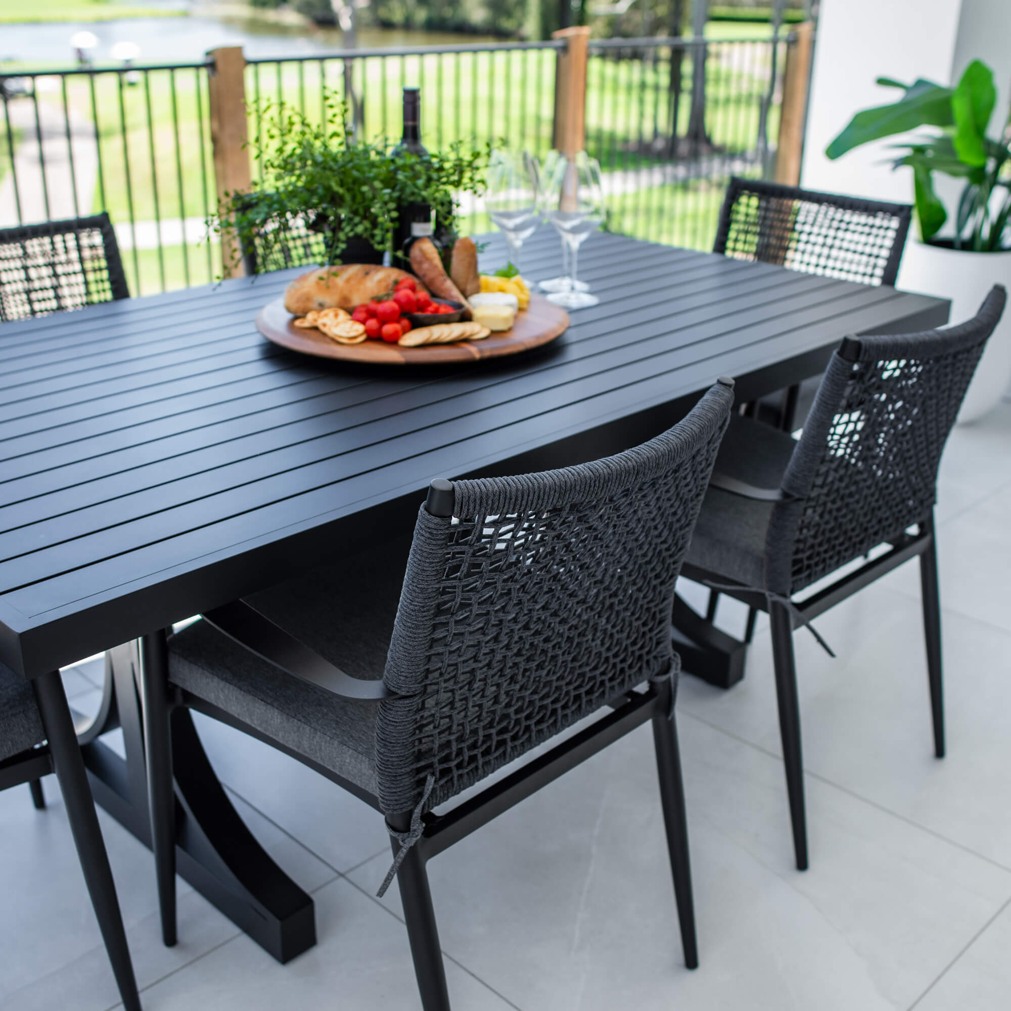 Crafted with Aluminium Frames and a Slatted Top, the Bergen Table provides style and durability. The Vienna Rope Chairs are made with Aluminium Frames and Textilene Rope to provide support and strength. This chair includes the seat cushion for extra comfort.