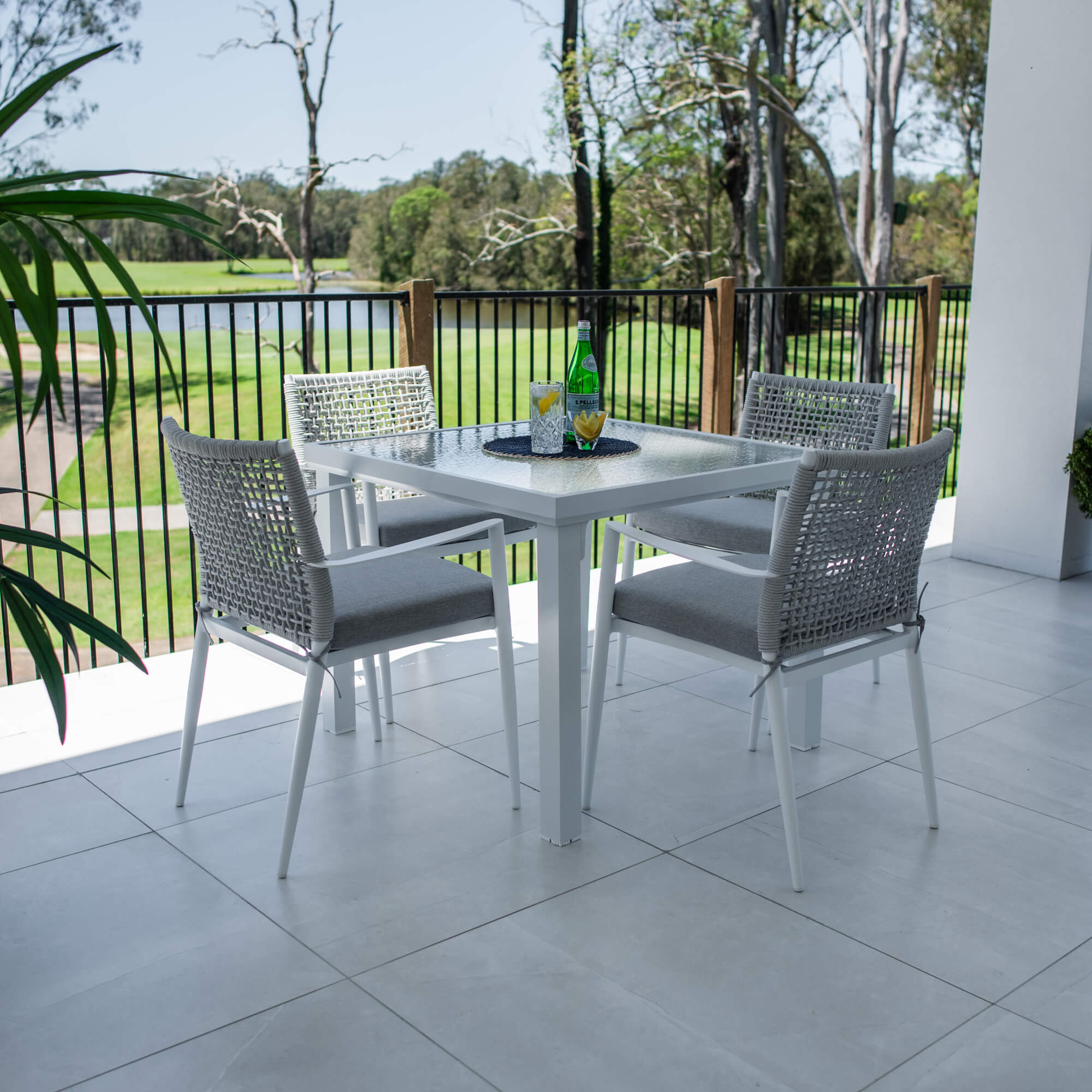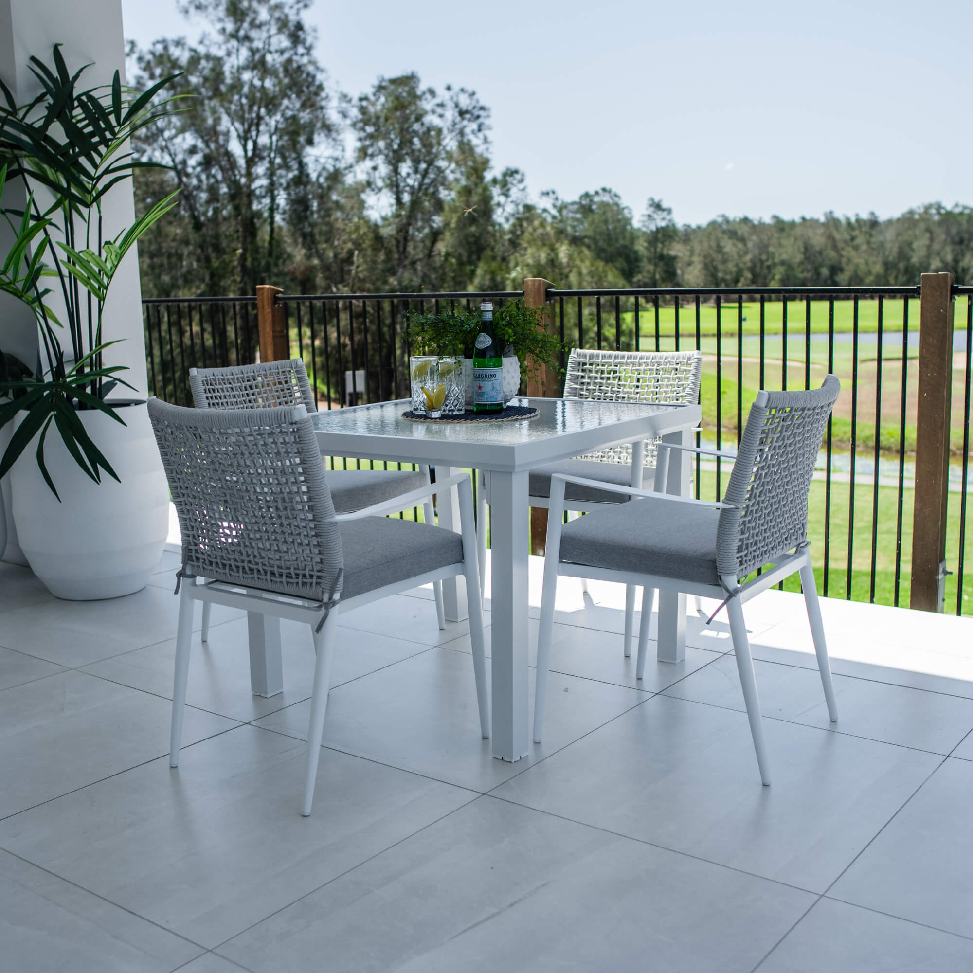 This outdoor setting includes 1 x Hudson Dining Table and 4 x Vienna Rope Dining Chairs