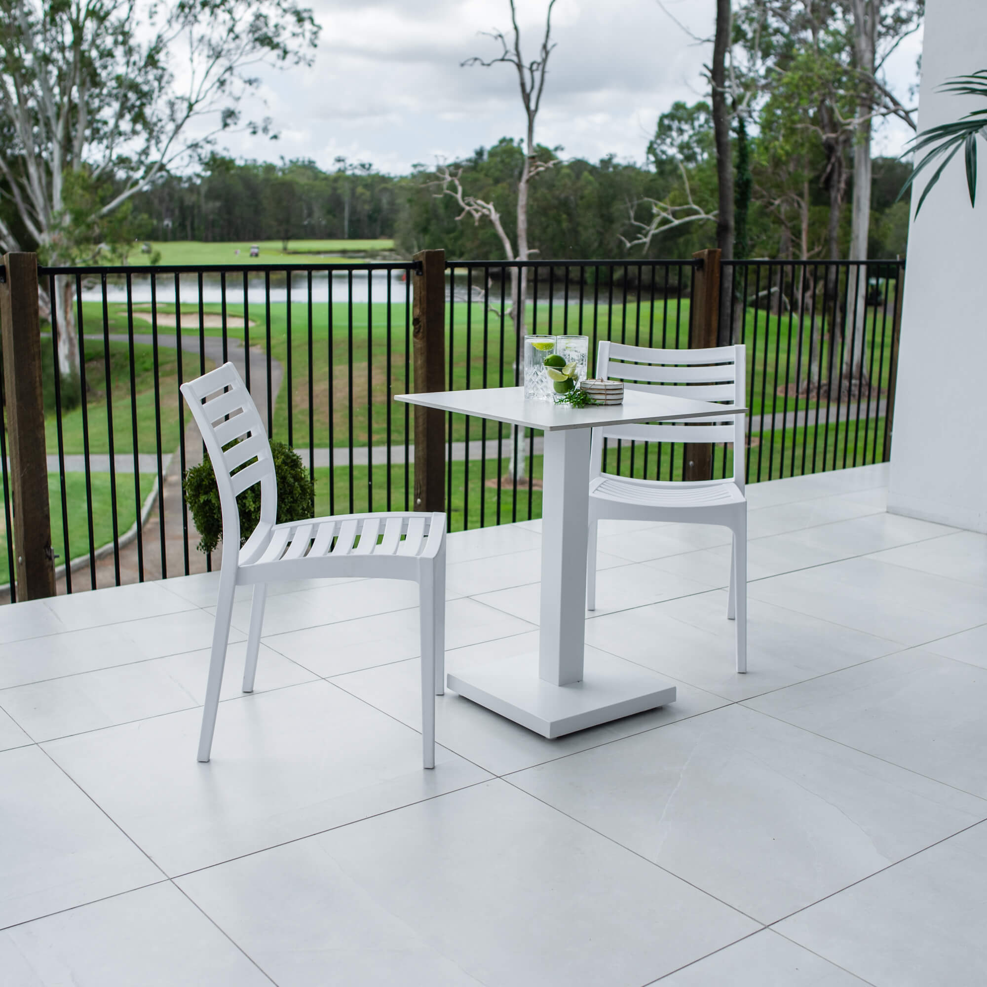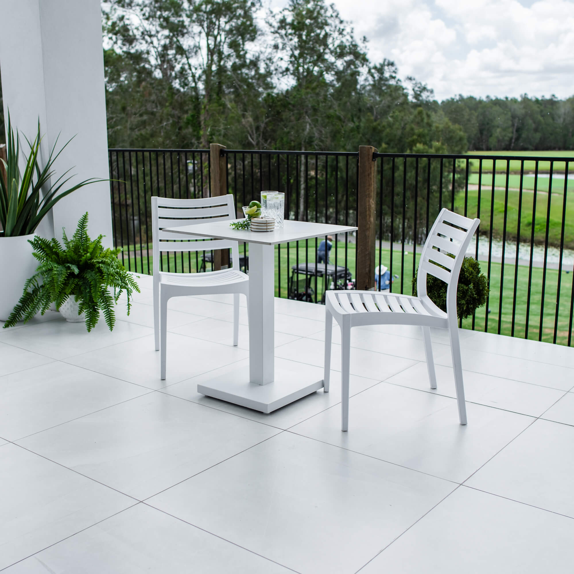This outdoor setting includes 1 x Lennox Dining Table and 2 x Apollo Dining Chairs