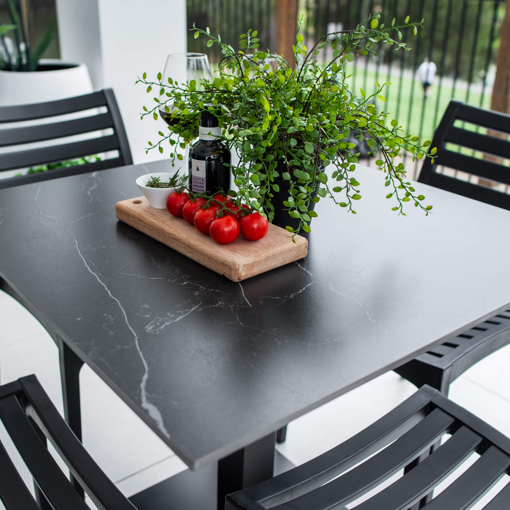Crafted with Aluminium Frames and a Sintered Stone Top, the Lennox Table provides style and durability. The Apollo Chairs are crafted with polypropylene resin frames, made with UV stabilizers.