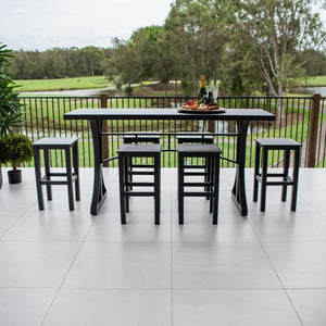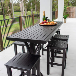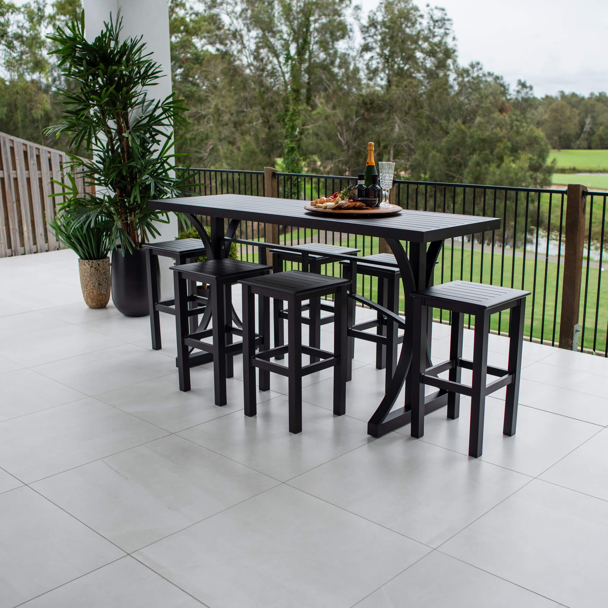 This outdoor setting includes 1 x Bergen Bar Table and 6 x Kirra Bar Stools