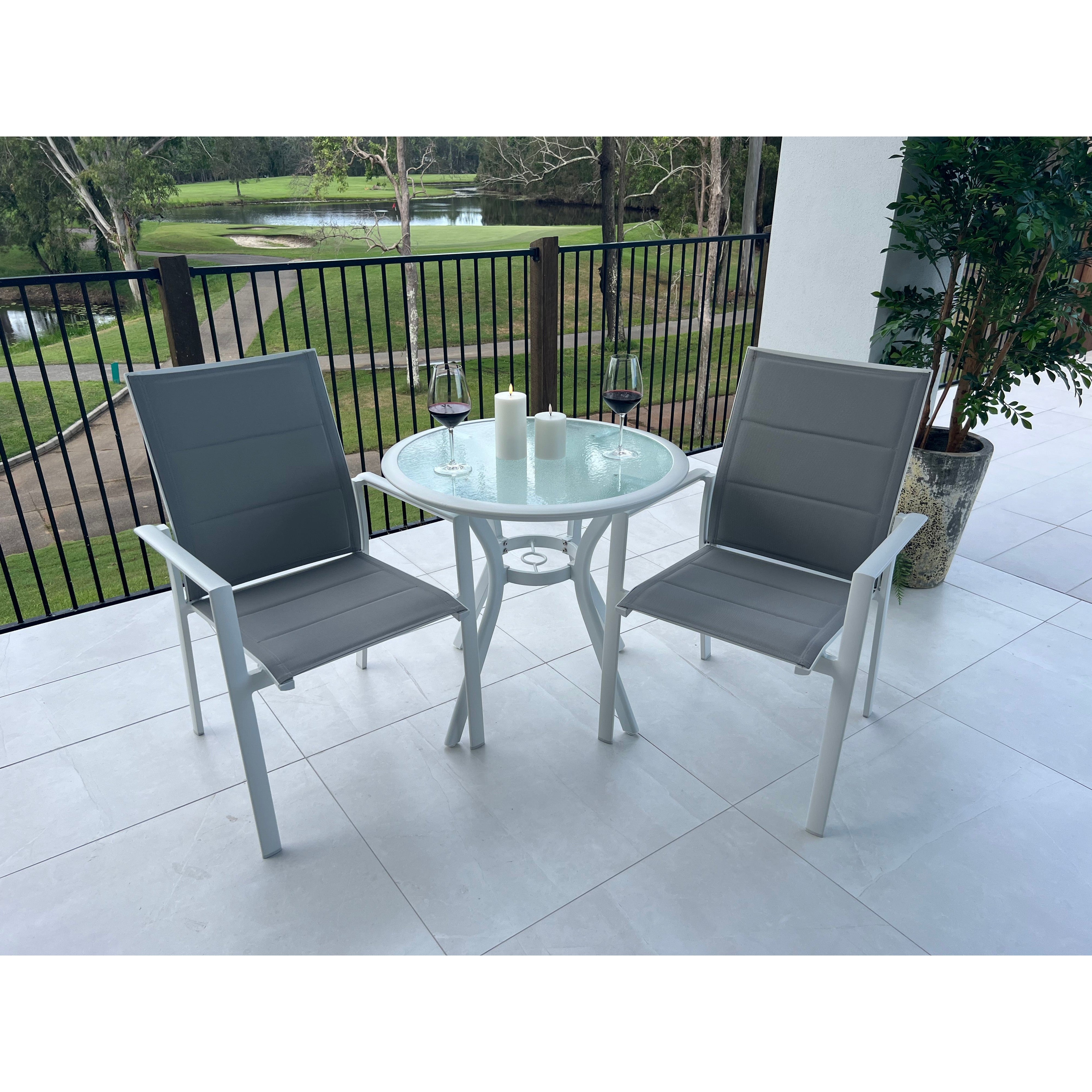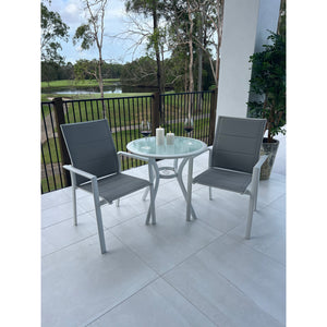 Crafted with Aluminium Frames and a Tempered Glass Top, the Coventry Table provides style and durability. The Margot Chairs are made with Aluminium Frames and a Padded Textilene Sling to provide comfort and strength.