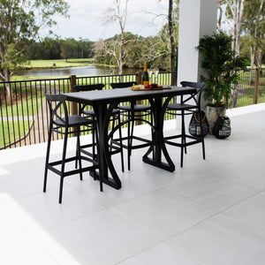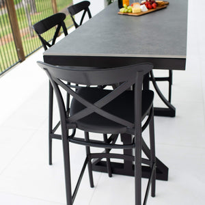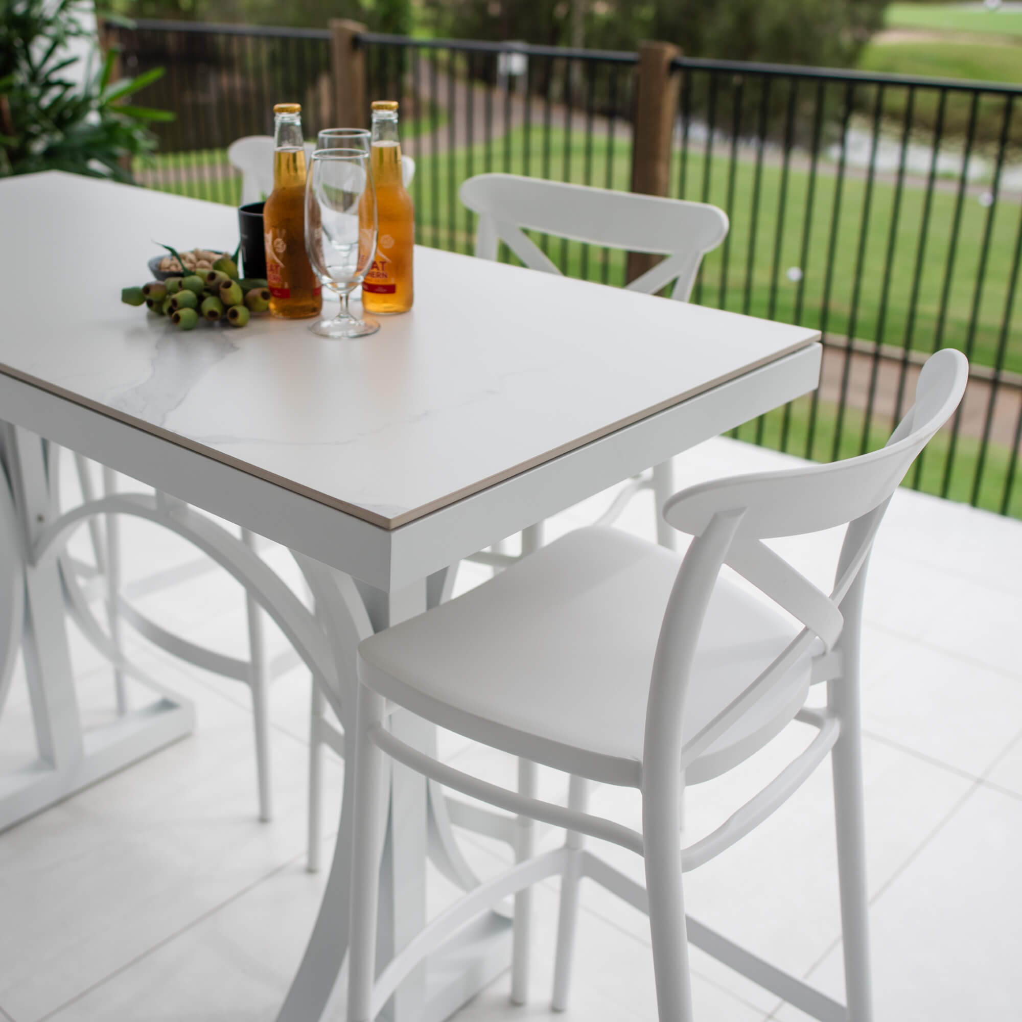 Crafted with Aluminium Frames and a Sintered Stone Top, the Malibu Table provides style and durability.The Portsea 75 Bar Stools are made out of a Resin material with a cross back design that provides durability and style. These bar stools are great for classic or hamptons style homes.