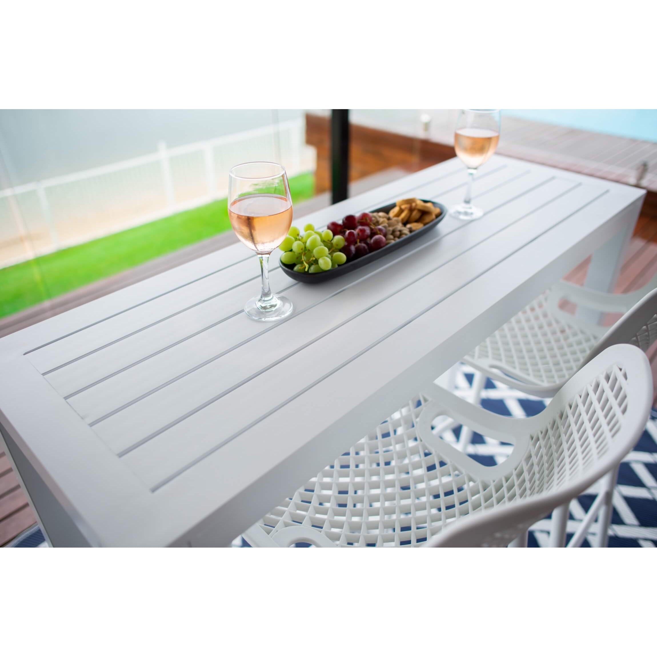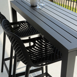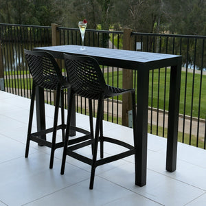 Crafted with Aluminium Frames and a Slatted Top, the Aria Bar Table provides style and durability. The Roma 75 Bar Stools are made out of a Resin material with a rounded seat design which moulds nicely with your body to provide comfort and strength.