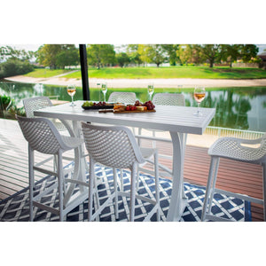 Crafted with Aluminium Frames and a Slatted Top, the Bergen Bar Table provides style and durability. The Roma 75 Bar Stools are made out of a Resin material with a rounded seat design which moulds nicely with your body to provide comfort and strength.