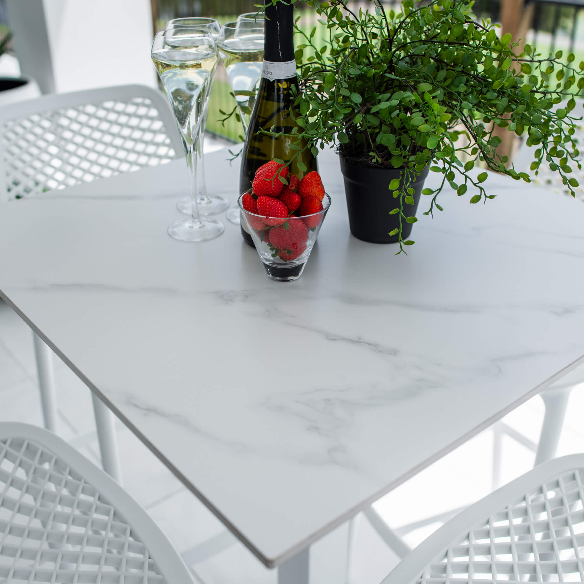 Crafted with Aluminium Frames and a Sintered Stone Top, the Lennox Table provides style and durability. The Roma 75 Barstools are crafted with polypropylene resin frames, made with UV stabilizers.