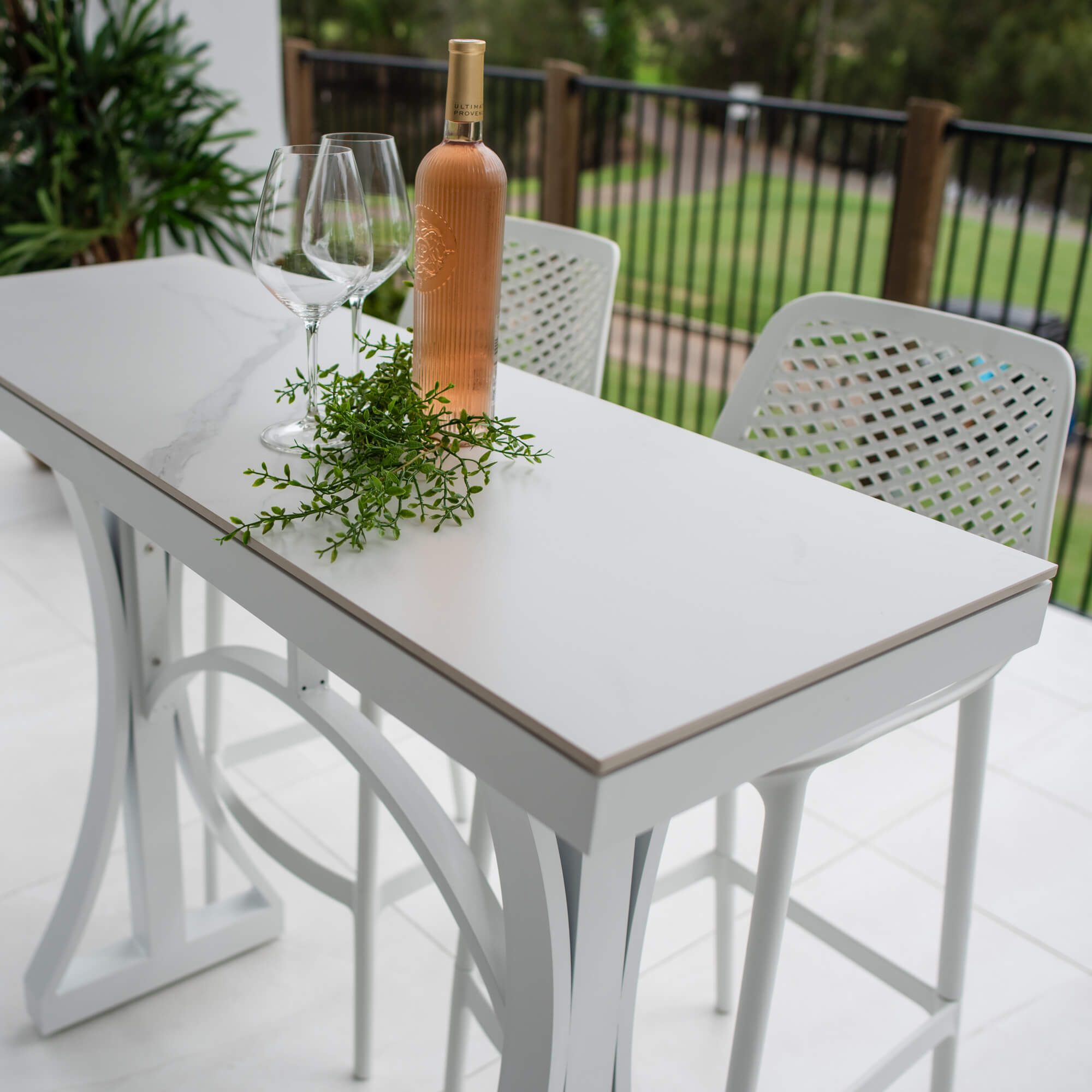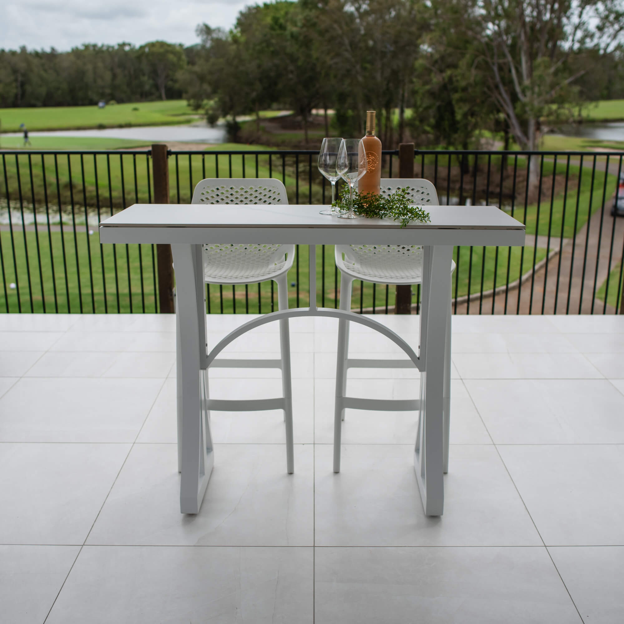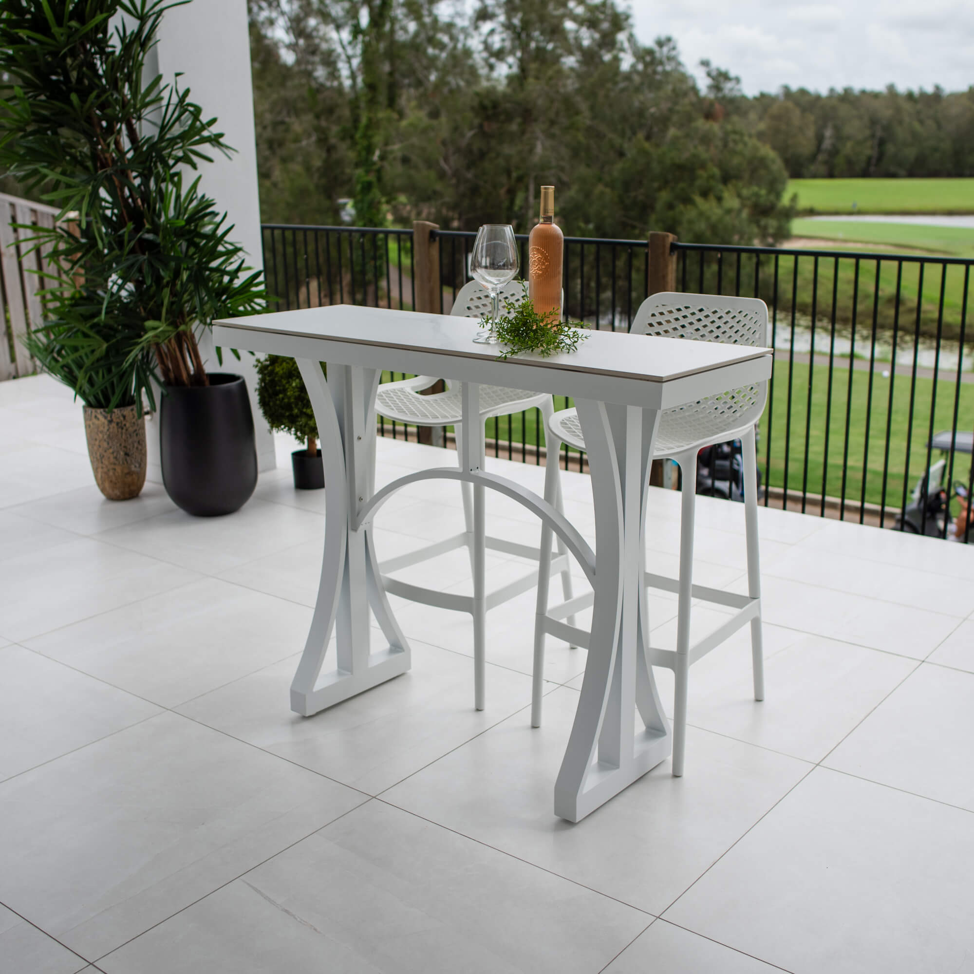 This outdoor setting includes 1 x Malibu Bar Table and 2 x Roma 75 Bar Stools.