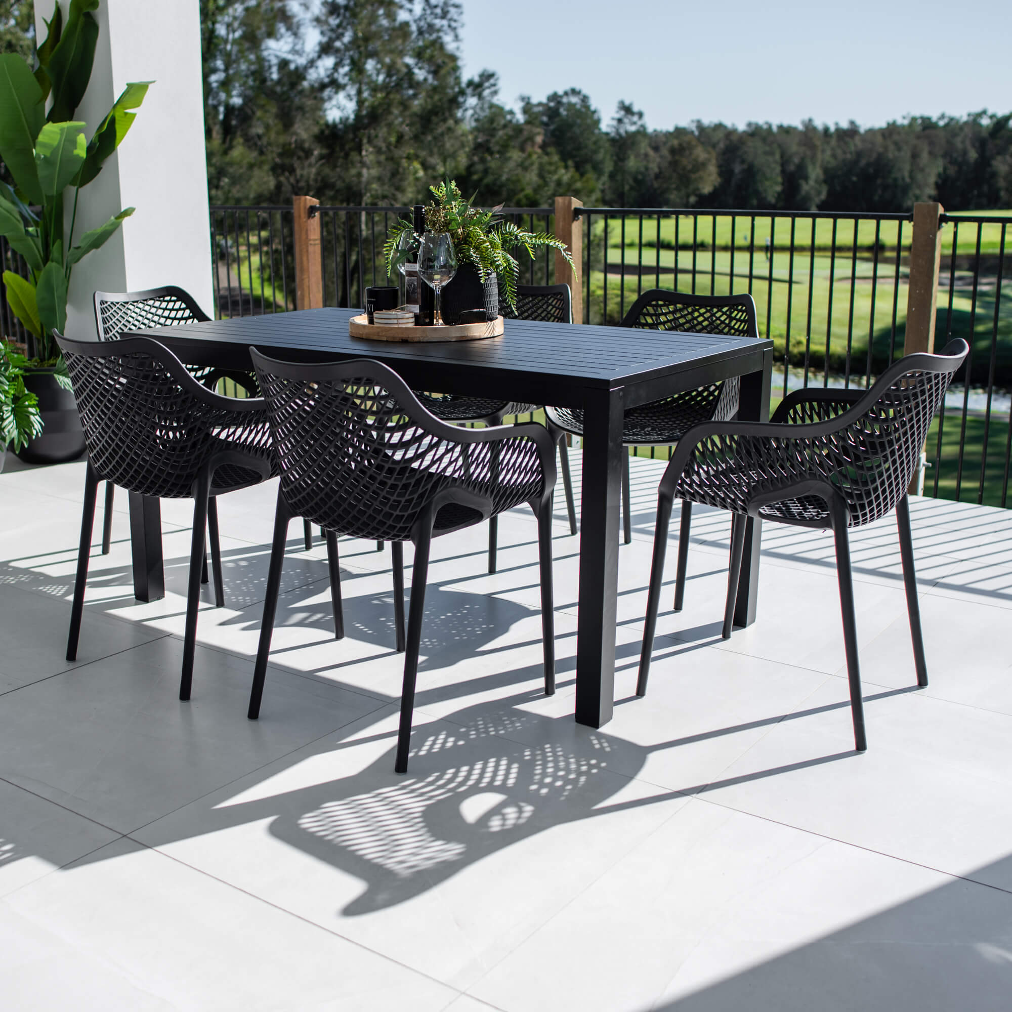 This outdoor setting includes 1 x Aria Dining Table and 6 x Roma XL Dining Chairs