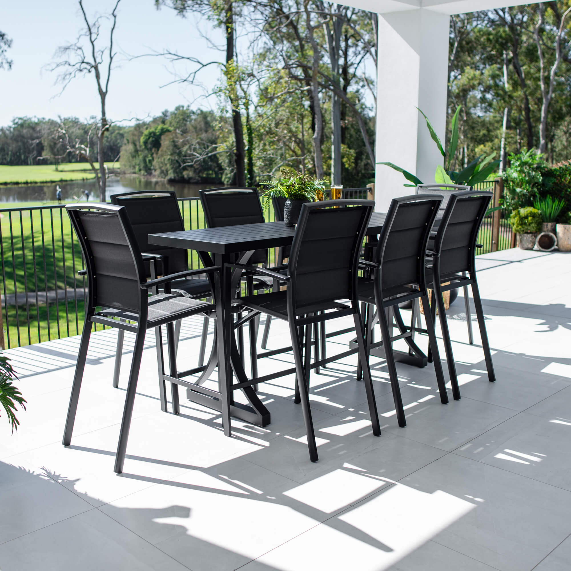 This outdoor setting includes 1 x Bergen Bar Table and 8 x Shelby Bar Stools