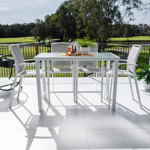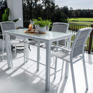 Crafted with Aluminium Frames and a Tempered Glass Top, the Hudson Bar Table provides style and durability. The Shelby Bar Stools are made out of Powder Coated Aluminium with a Padded Textilene Sling for comfort and durability. This bar stool is designed with an arched back for extra lumbar support.