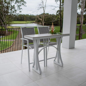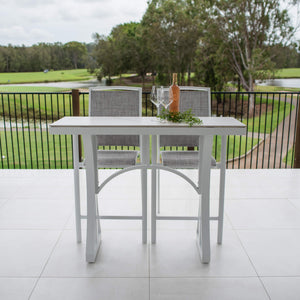 This outdoor setting includes 1 x Malibu Bar Table and 2 x Shelby Bar Stools.