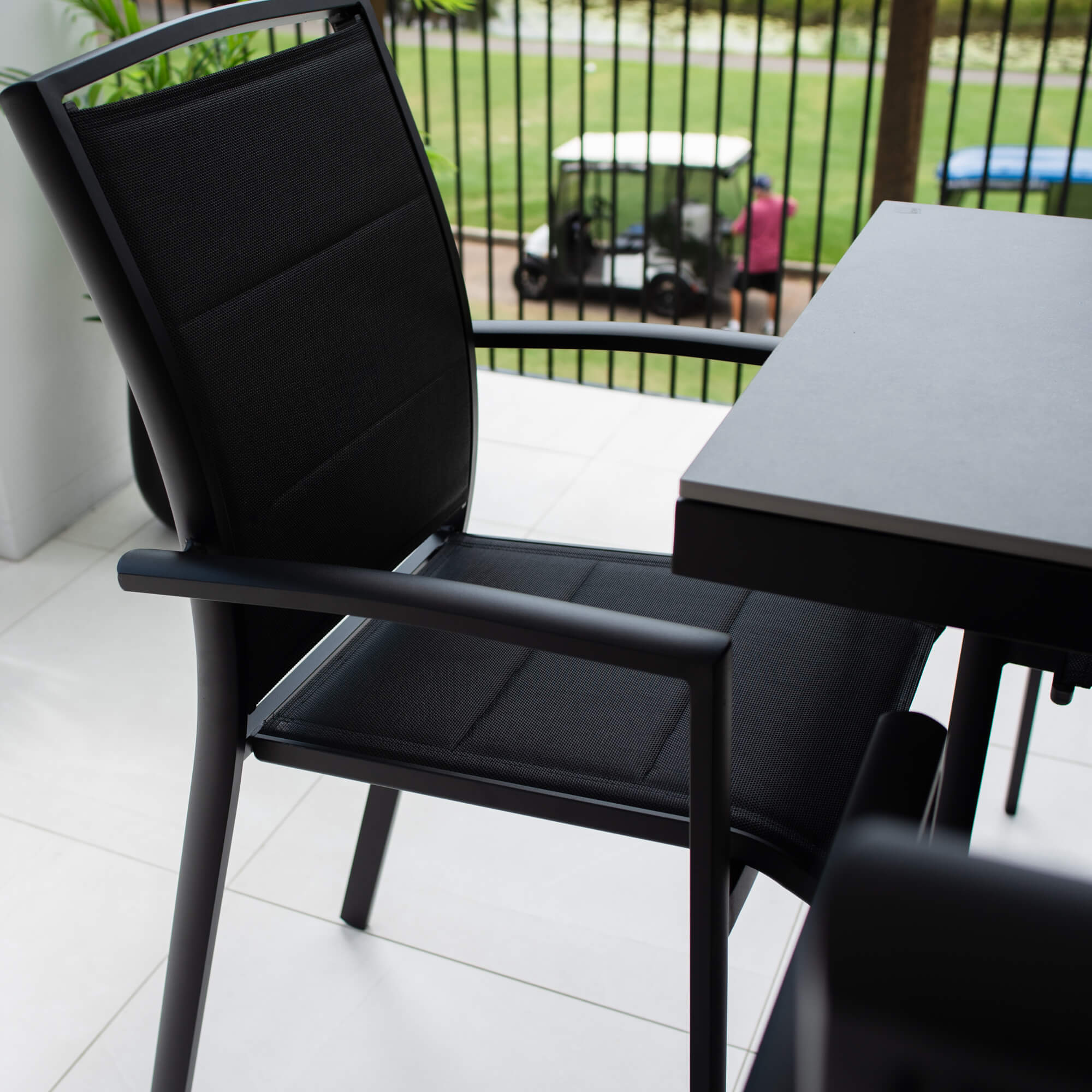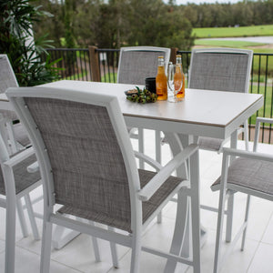 Crafted with Aluminium Frames and a Sintered Stone Top, the Malibu Table provides style and durability. The Shelby Barstools have Powder Coated Aluminium frames and a Padded Textilene Sling, making it the perfect combination of durability, comfort and style. This chair also is made with an arched back for lumbar support.