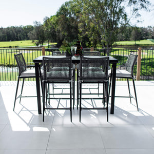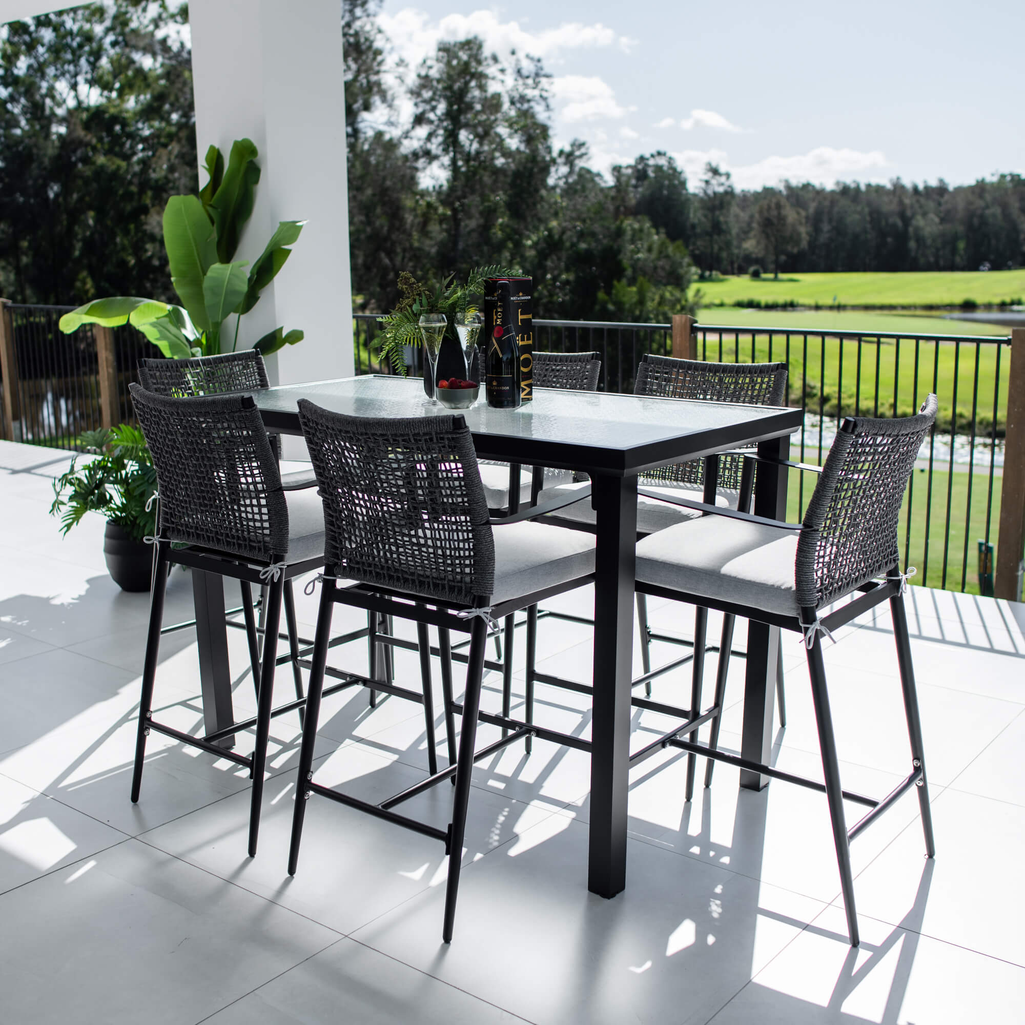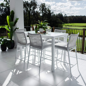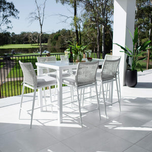 This outdoor setting includes 1 x Hudson Bar Table and 6 x Vienna Rope Bar Stools.