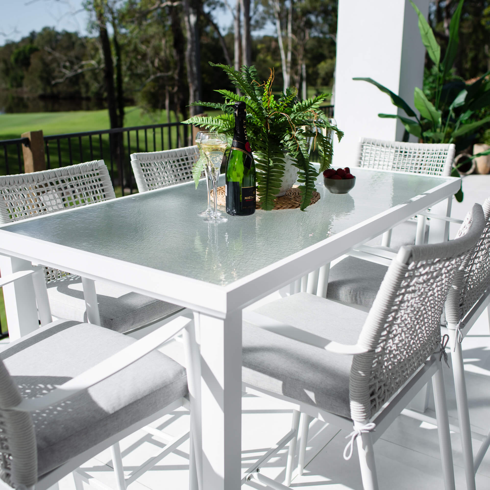 Crafted with Aluminium Frames and a Tempered Glass Top, the Hudson Table provides style and durability. The Vienna Rope Barstools are made with Aluminium Frames and Textilene Rope to provide support and strength. This barstool includes the seat cushion for extra comfort.