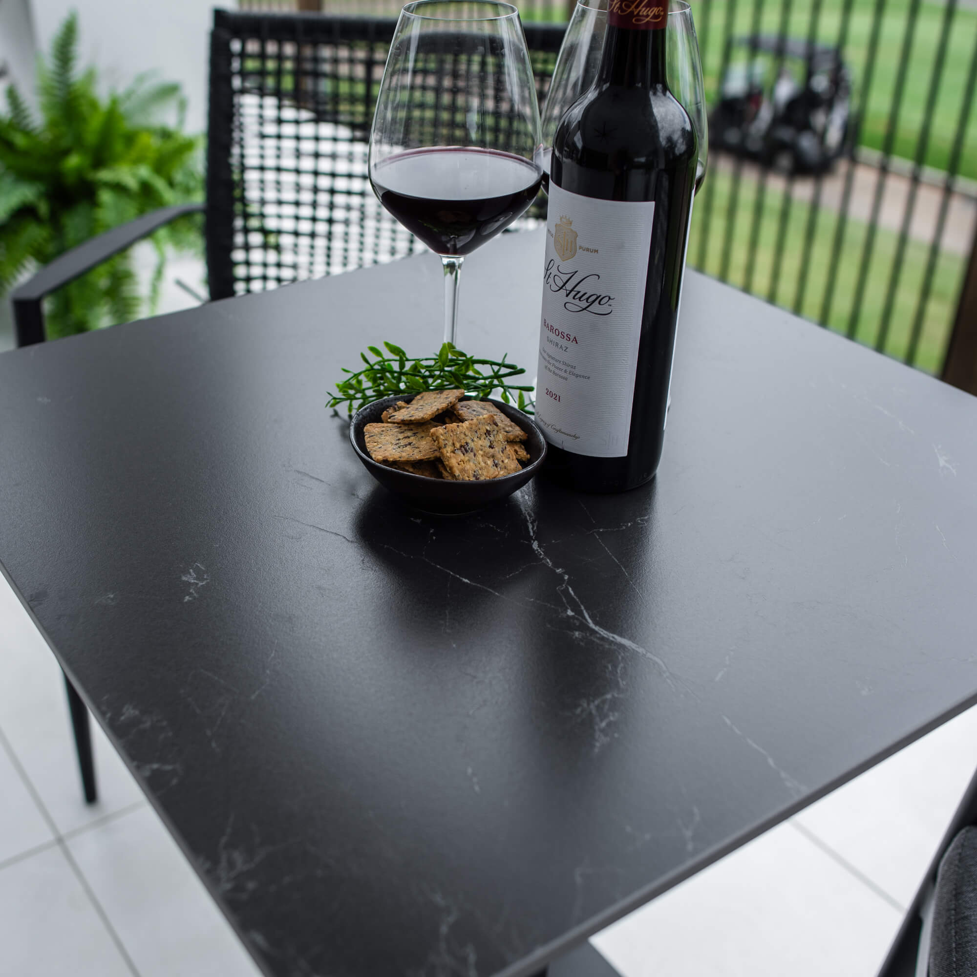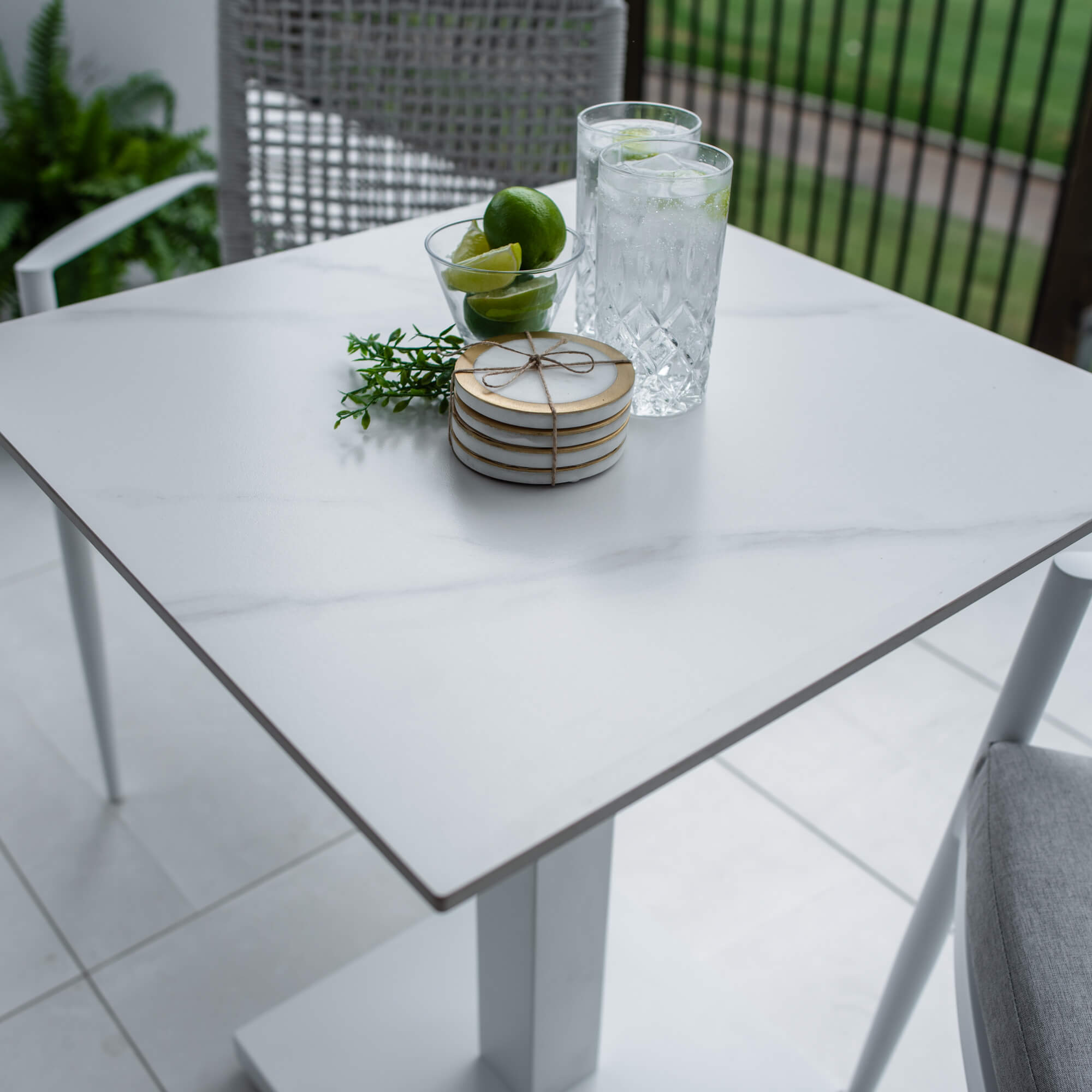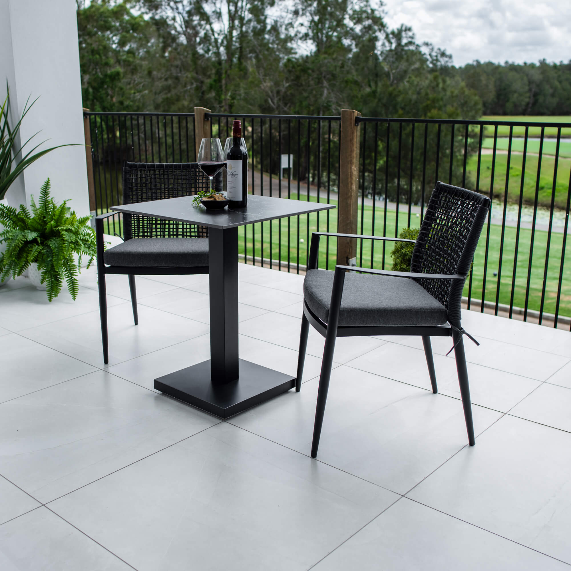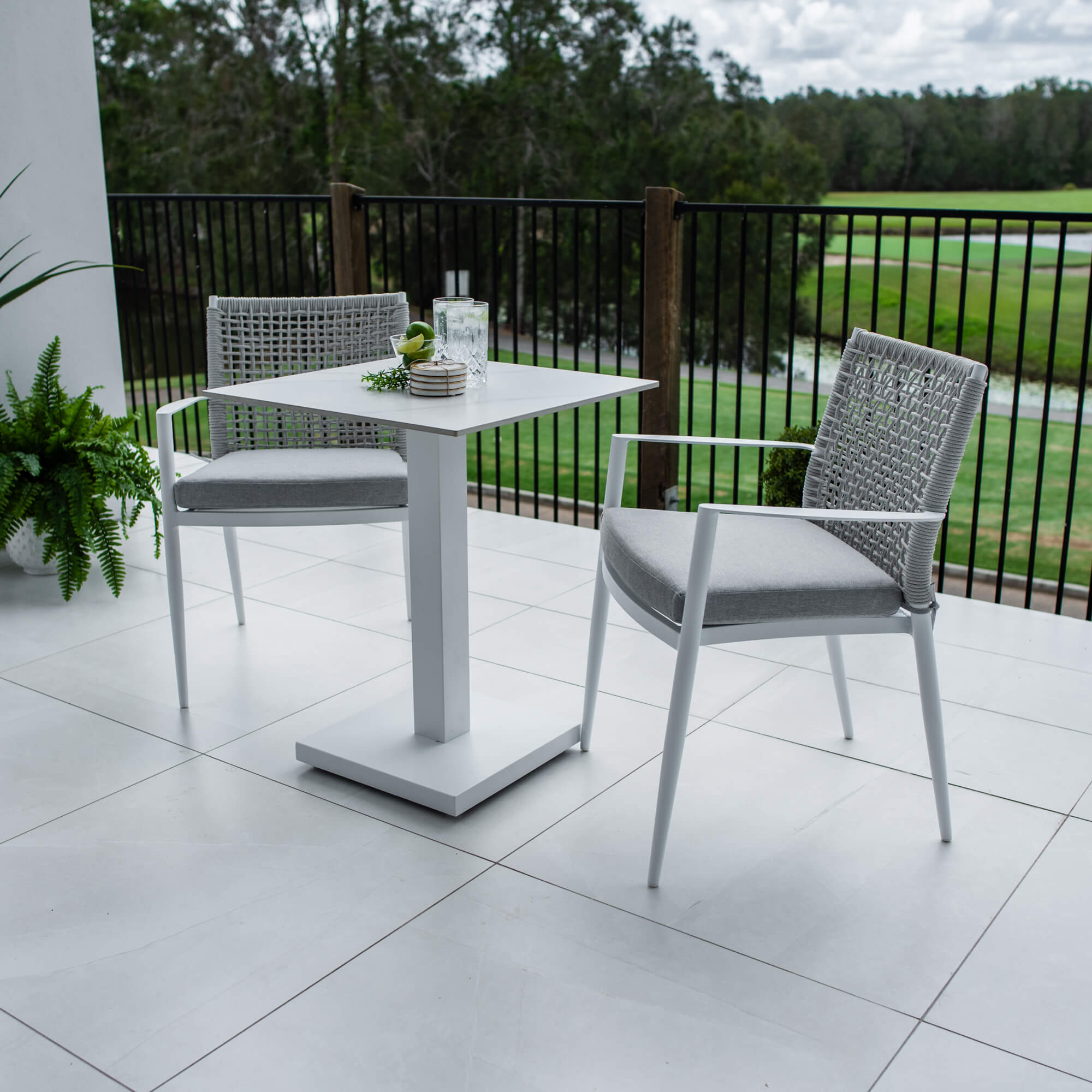 Crafted with Aluminium Frames and a Sintered Stone Top, the Lennox Table provides style and durability. Made with a stone base, the sturdiness of the Lennox Table is perfect for windy balconies. The Vienna Rope Dining chairs are made with Aluminium Frames and Textilene Rope to provide style and strength. This chair includes the seat cushion.