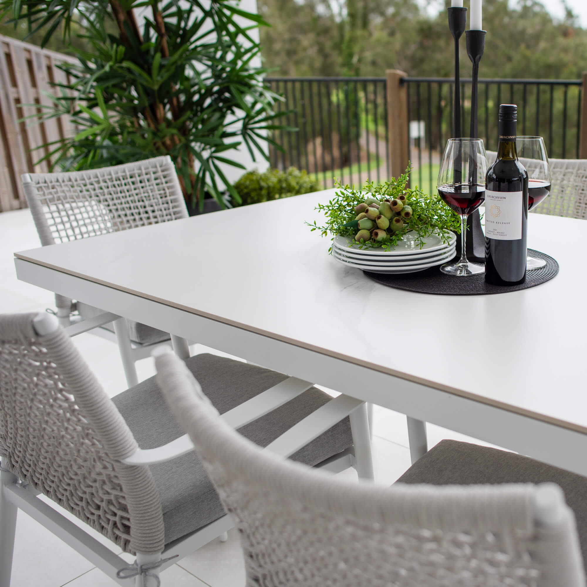 Crafted with Aluminium Frames and a Sintered Stone Top, the Malibu Table provides style and durability. The Vienna Rope Chairs are made with Aluminium Frames and Textilene Rope to provide support and strength. This chair includes the seat cushion for extra comfort.