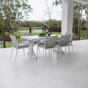 This outdoor setting includes 1 x Malibu Dining Table and 6 x Vienna Rope Dining Chairs